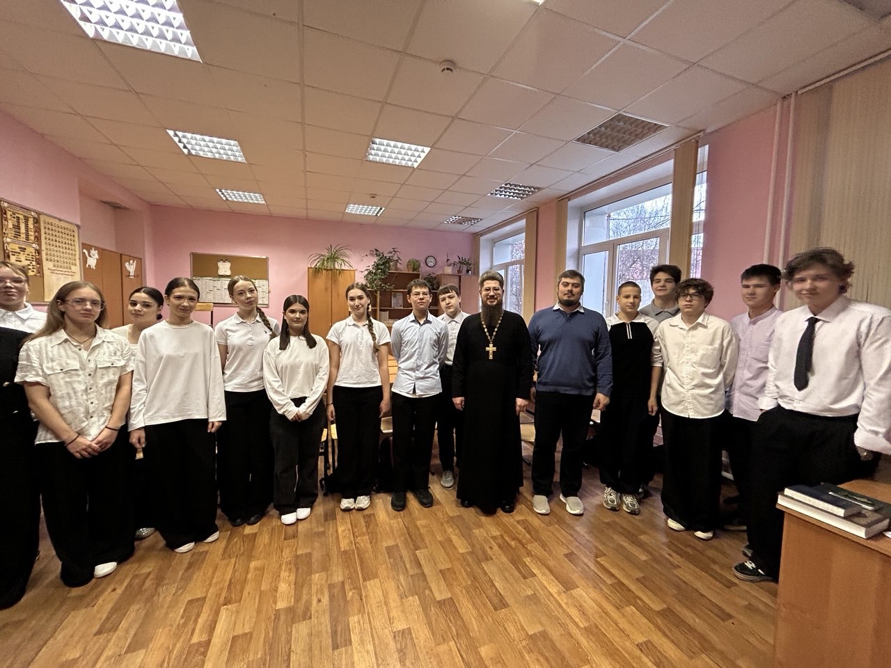14 ноября, в рамках Московских областных Рождественских образовательных чтений «Просвещение и нравственность: формирование личности и вызовы времени», в школе №3 имени Героя Советского Союза А.Г.Дудкина города Фрязино прошла встреча учеников 9 «Б» класса с настоятелем Державного храма Наукограда священником Димитрием Третьяковым.