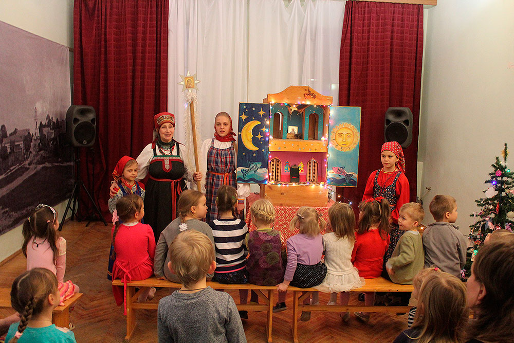 03 января учащиеся воскресной школы Сергиевского храма с. Трубино показали Рождественский кукольный спектакль «Вертеп» для младшей группы Семейной фольклорно-этнографической студии «Светелка» Центра Культуры и Досуга «Факел» г. Фрязино.