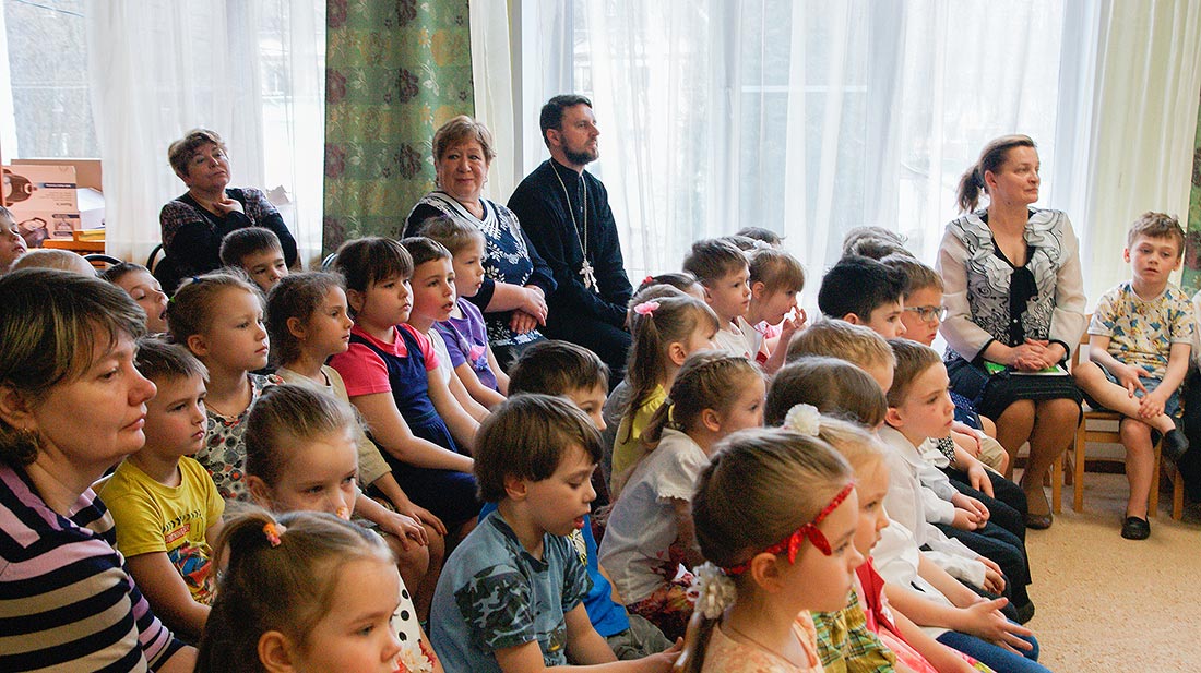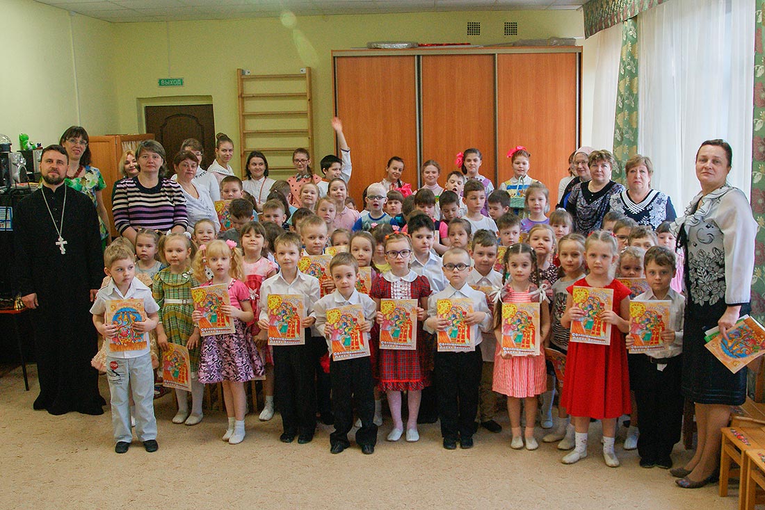 18 апреля воспитанники воскресной школы храма иконы Божией Матери «Спорительница хлебов» г. Щелково во главе с настоятелем храма священником Александром Мороковым по приглашению заведующей Елены Владимировны Мрыхиной посетили дошкольное образовательное учреждение детский сад №25 «Малыш» комбинированного вида.