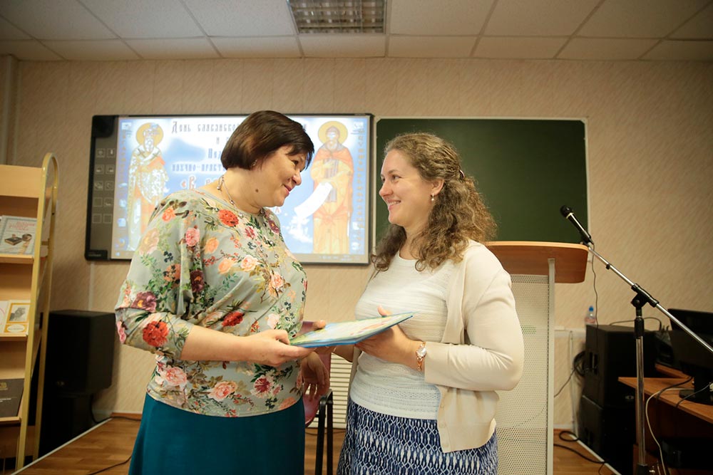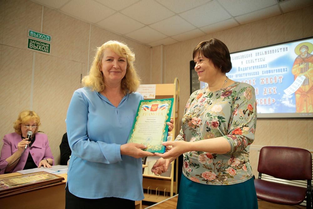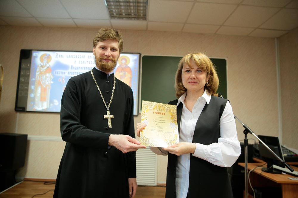 В этот день прошло награждение педагогов – победителей и призеров муниципального этапа предметной недели духовно-нравственной культуры. Грамоты Комитета по образованию Администрации Щелковского муниципального района были вручены учителю основ православной культуры МБОУ Биокомбинатовская СОШ В.И. Рудыч, учителю географии и духовного краеведения Подмосковья МАОУ СОШ №17 Д.А. Киновскому, учителю истории и обществознания МБОУ СОШ №16 Т.А. Балыко, учителю духовно-нравственных дисциплин МБОУ Щелковский лицей №7 Е.Н. Афанасьевой, учителю истории МБОУ СОШ №8 Е.А. Ермолаевой и учителю истории и обществознания МБОУ Краснознаменская СОШ Т.Н. Егоровой.