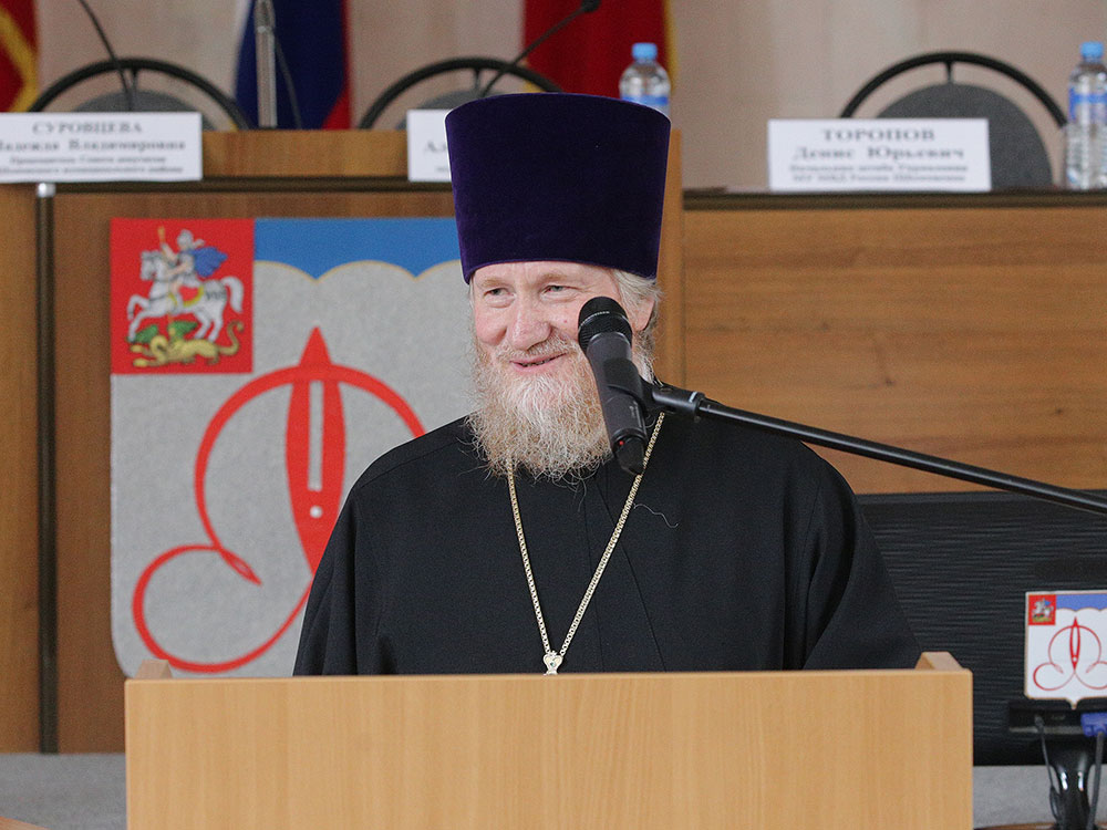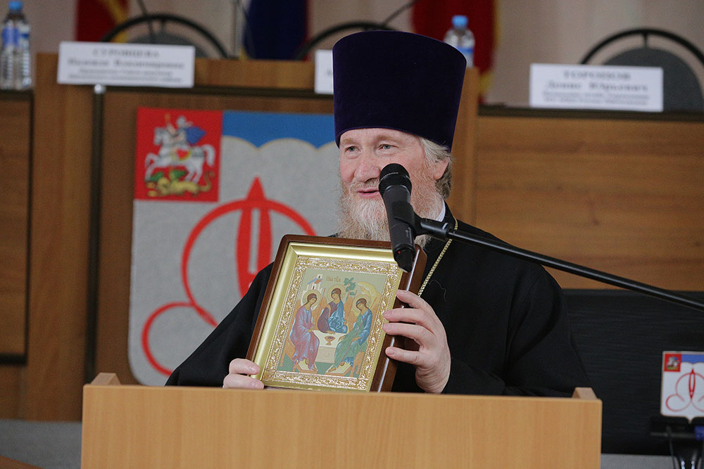 От имени Правящего архиерея Московской епархии митрополита Крутицкого и Коломенского Ювеналия благочинный церквей Щелковского округа протоиерей Андрей Ковальчук поздравил с вступлением в должность Главу Щелковского района А.В. Валова и председателя районного Совета депутатов Н.В. Суровцеву и преподнес им икону Пресвятой Троицы и Святое Евангелие.