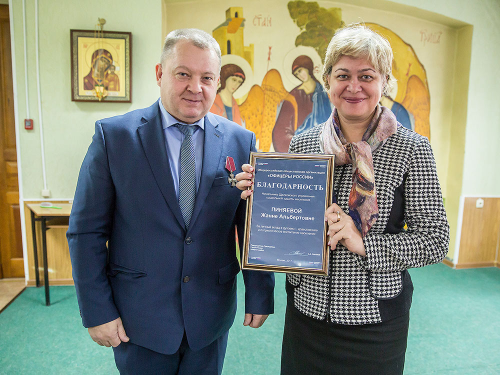От общественной организации «Офицеры России» благочинному Щелковского округа протоиерею Андрею Ковальчуку и начальнику Щелковского управления социальной защиты населения Ж.А. Пиняевой были вручены благодарности за личный вклад в духовно-нравственное и патриотическое воспитание населения.