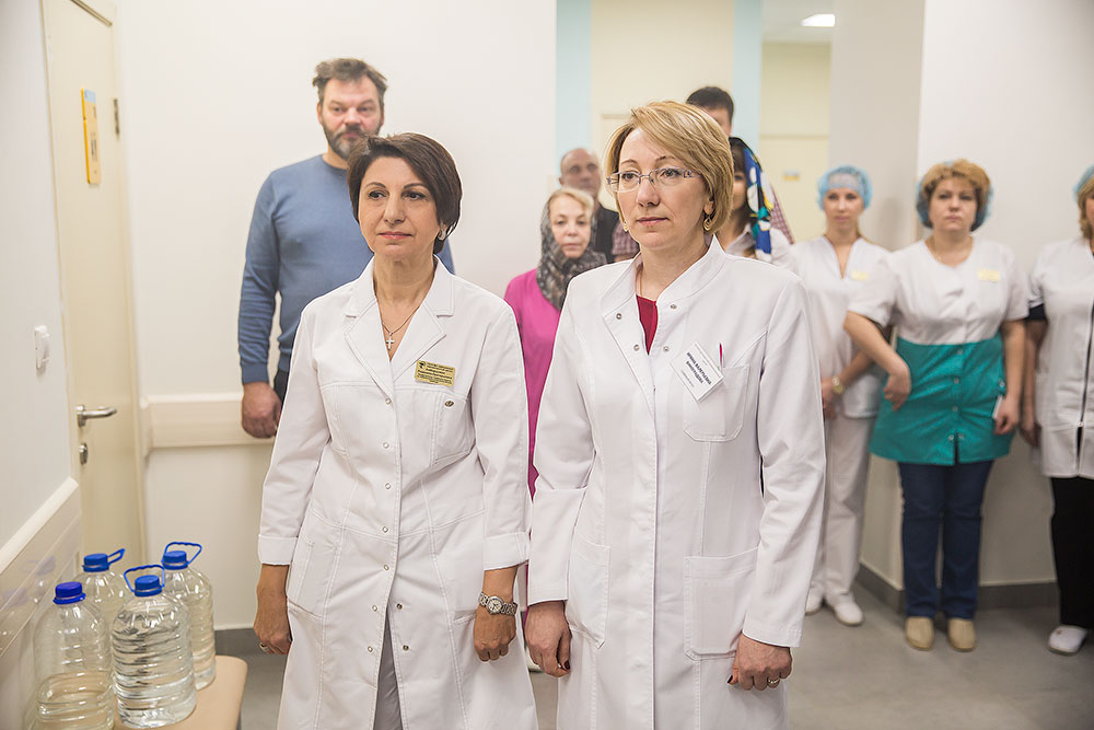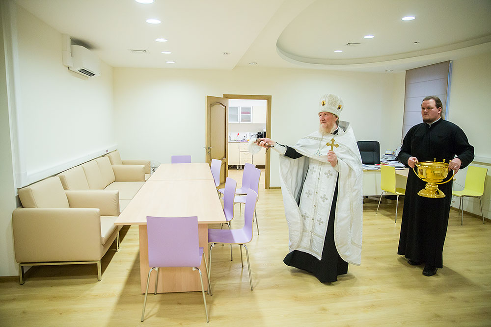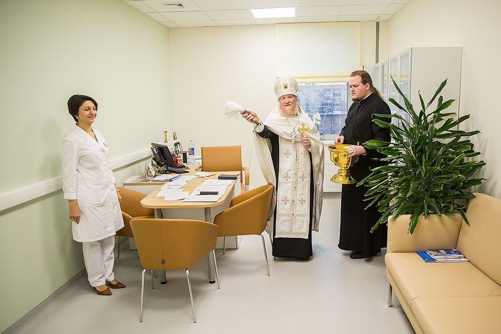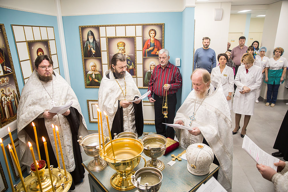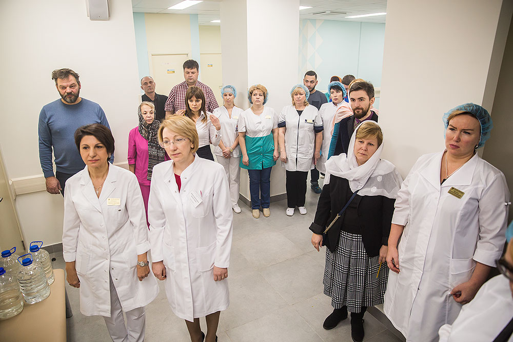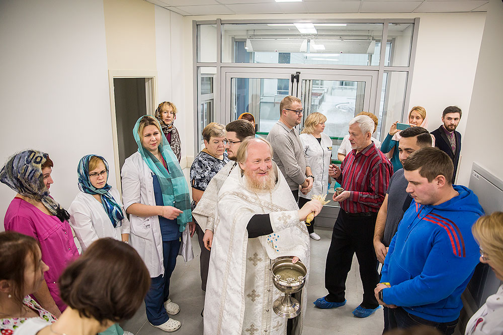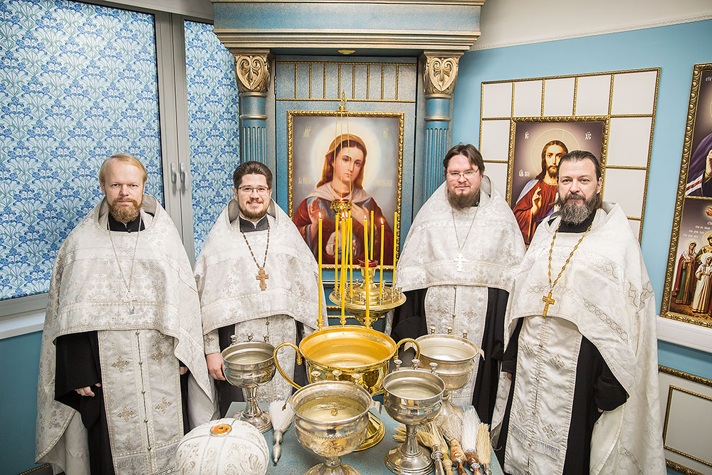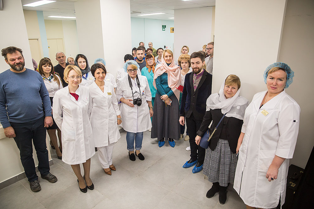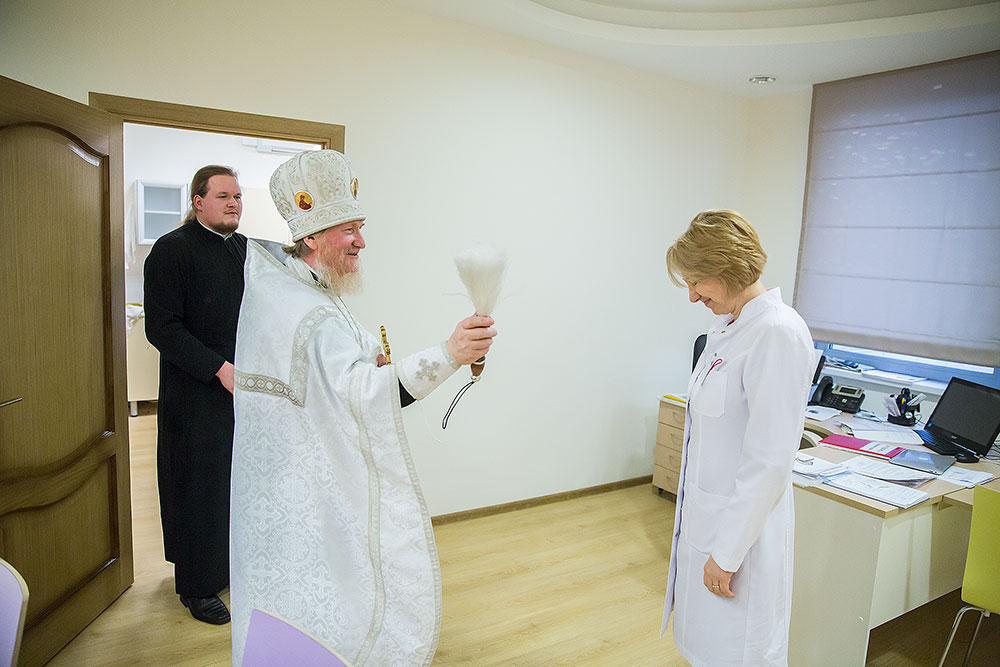 На освящении молились главврач центра И. В. Виноградова, зам. главврача Л.Г. Амбарцумян, медицинский персонал, роженицы и сотрудники Просветительского центра защиты семьи, материнства и детства «ЗАрождение» г. Щелково.