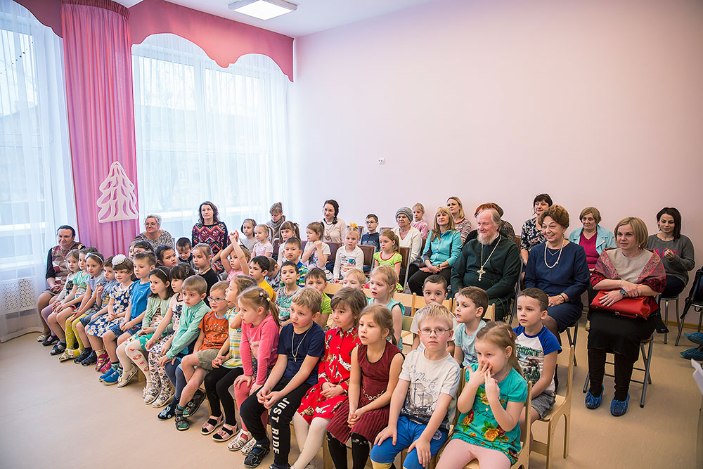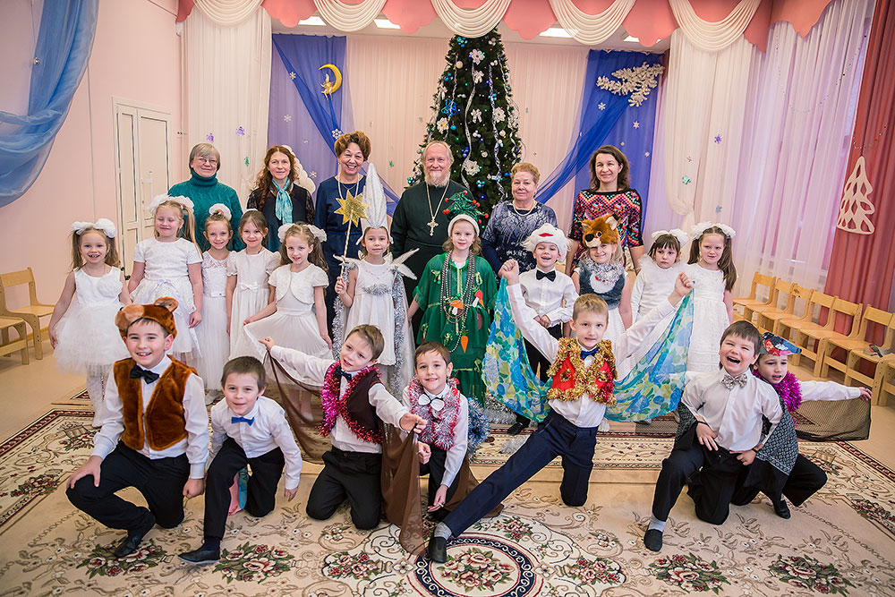 В этот день в детском саду проходил детский Рождественский праздник. Перед присутствующими в зале зрителями выступили воспитанники детского сада. Они порадовали гостей Рождественским представлением, на котором пели колядки, читали стихи и показали Рождественскую сказку. Подготовила сценарий и провела праздник катехизатор храма преподобного Серафима Саровского г. Щелково Л.Г. Мартюшева. Аккомпанировала И.В. Самошина, музыкальный редактор телевидения канала «Культура». Дети очень эмоционально и выразительно, с большим интересом выступали, были настоящими маленькими артистами. Даже отцу Андрею и Татьяне Иосифовне пришлось играть в колокола во время песнопений.
