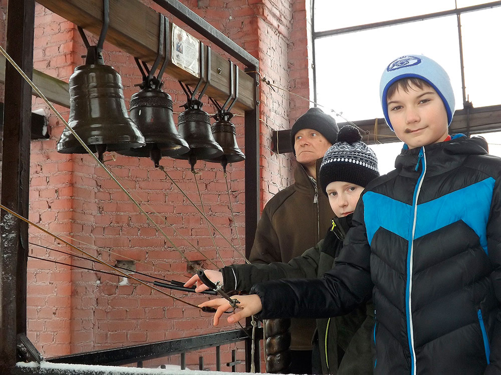 Экскурсию для гостей провел клирик собора священник Димитрий Медведев. Ребята с интересом слушали об истории храма, местночтимых святых, а в завершении - поднялись на колокольню и позвонили в колокола.