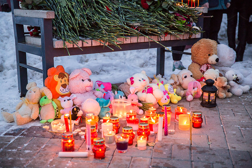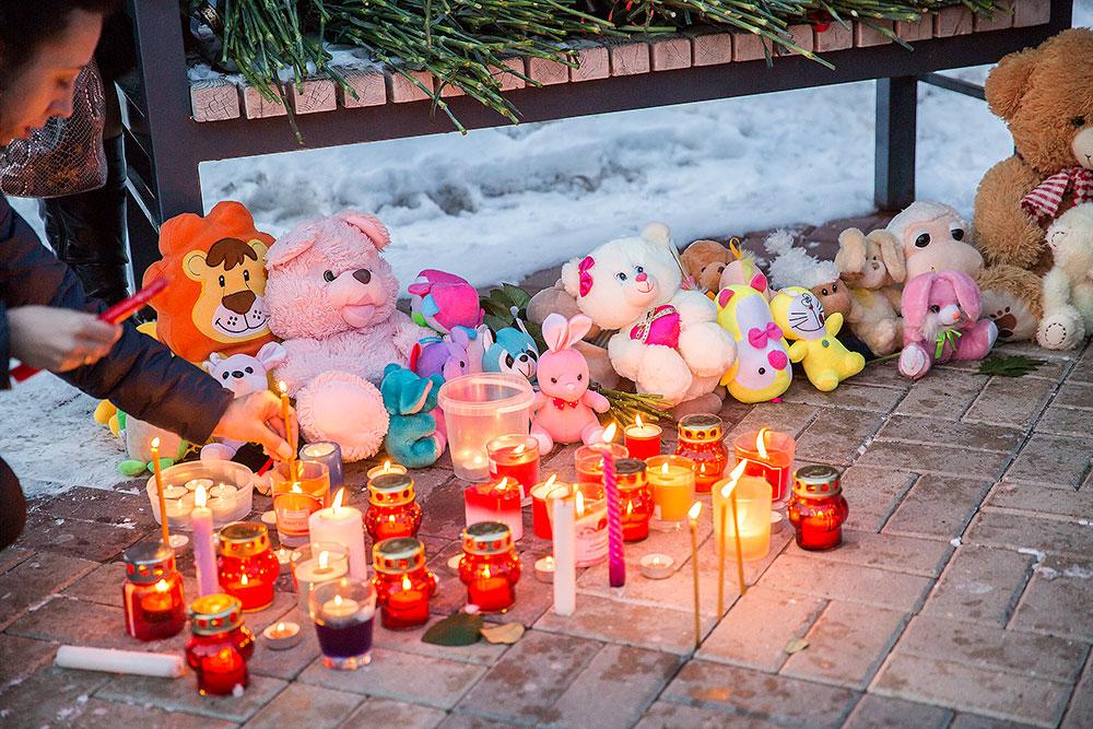 Жители района возлагали к временному мемориалу памяти цветы, свечи, мягкие игрушки.