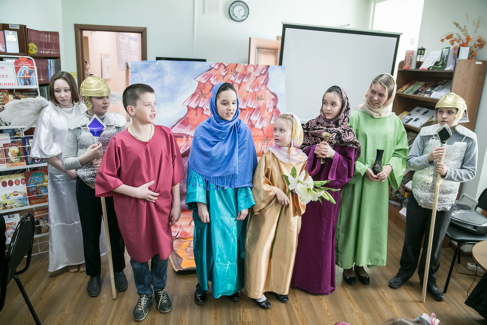 Воспитанники воскресной школы храма иконы Божией Матери «Спорительница хлебов» представили театральную Пасхальную постановку «Воскресение». Руководитель – Екатерина Морокова. Прекрасный танцевальный номер показали дети из воскресной школы храма Покрова Пресвятой Богородицы. Самые маленькие артисты прочли пасхальные стихи, а их руководитель – Куракина Татьяна Анатольевна, подготовила стихотворение Бориса Пастернака «Гефсиманский сад». Поиграть в пасхальные игры пригласила всех желающих сотрудница центра Мастерских Марина Викторовна. Шуточные соревнования понравились всем!