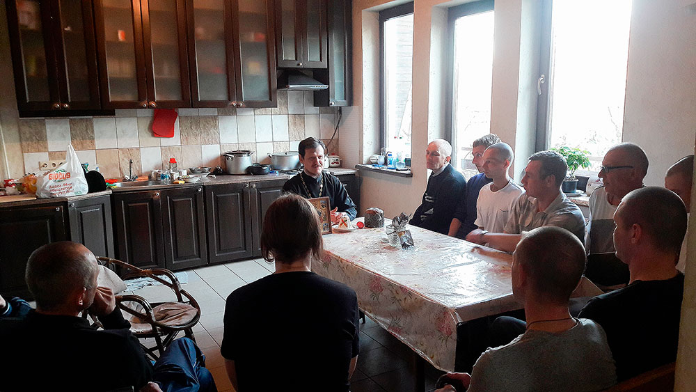 Познакомившись с обитателями приюта, отец Димитрий поздравил их с праздником Светлого Христова Воскресения и на примере пасхальных символов - кулича, пасхи и яйца – рассказал о смысле праздника. В непринужденной атмосфере, за чаепитием батюшка познакомился с непростыми жизненными обстоятельствами людей, попавших в это заведение, среди которых оказалось немало бывших заключенных и наркоманов. В качестве пасхального подарка священник привез для приюта несколько куличей и творожную пасху.