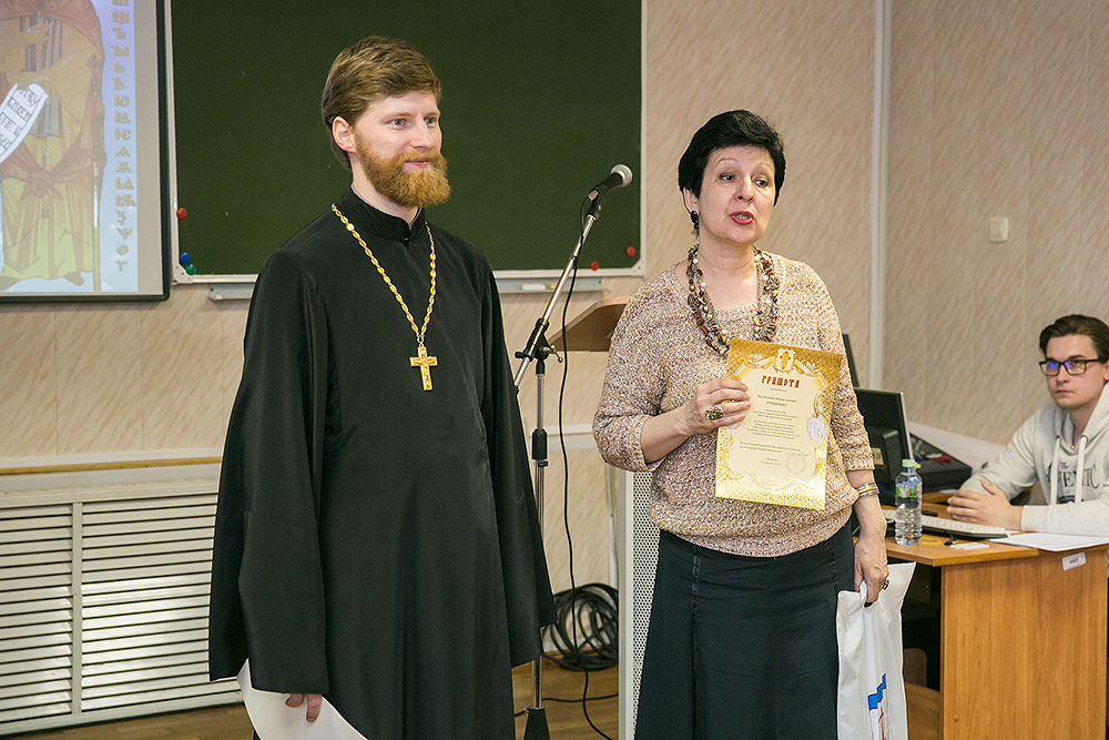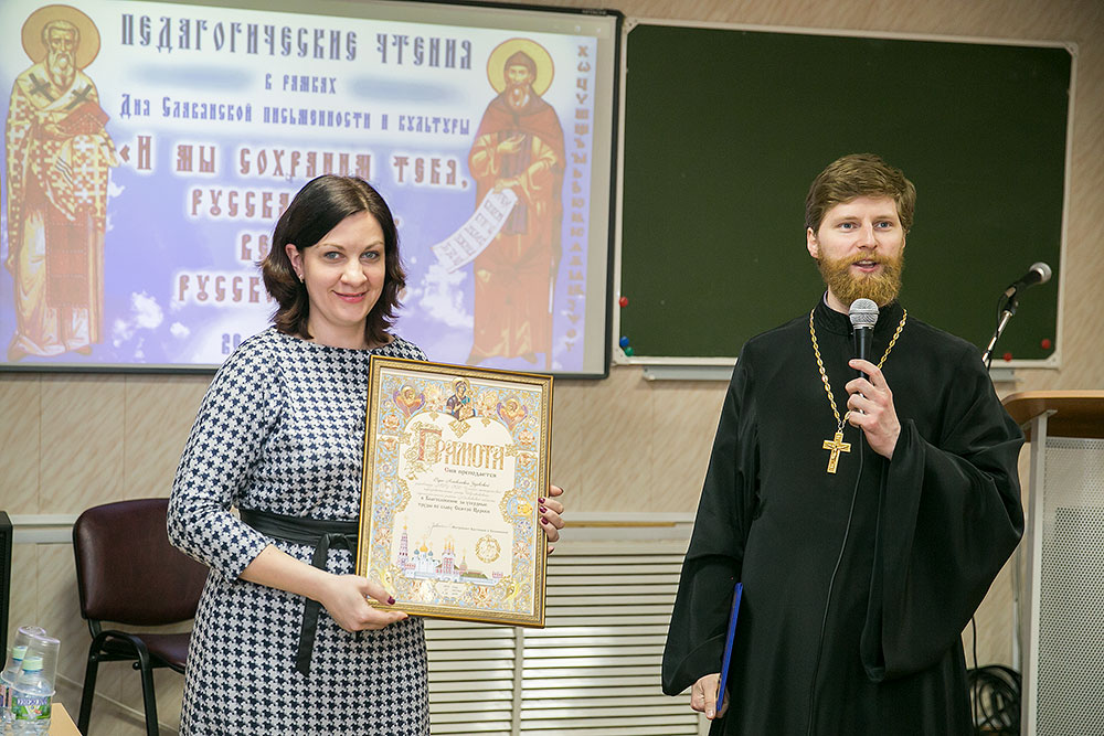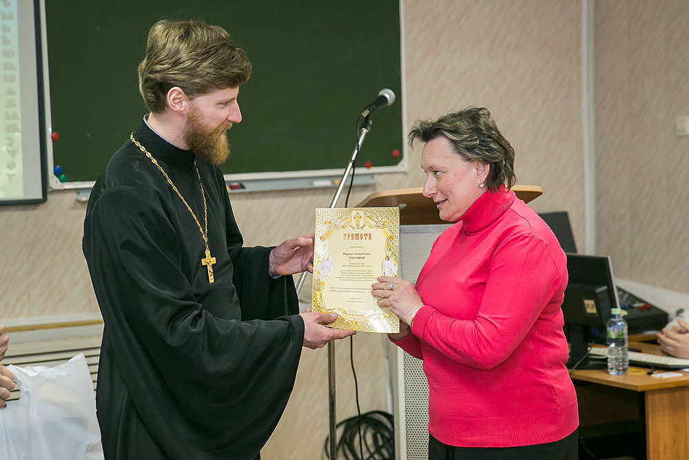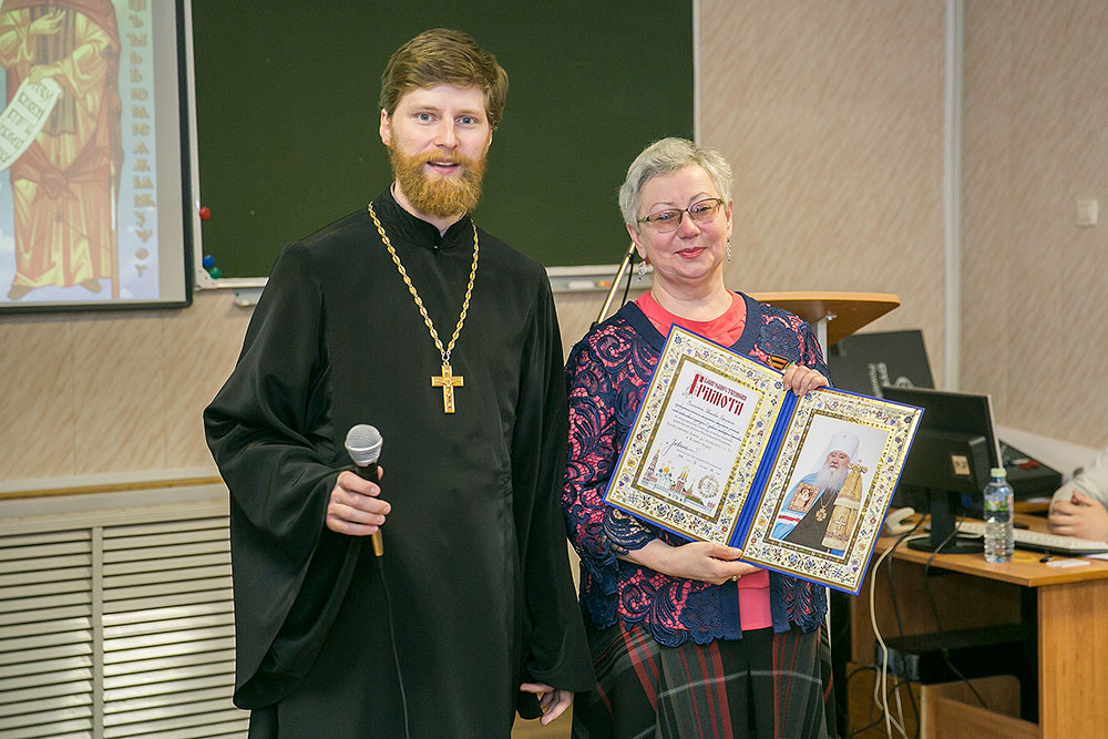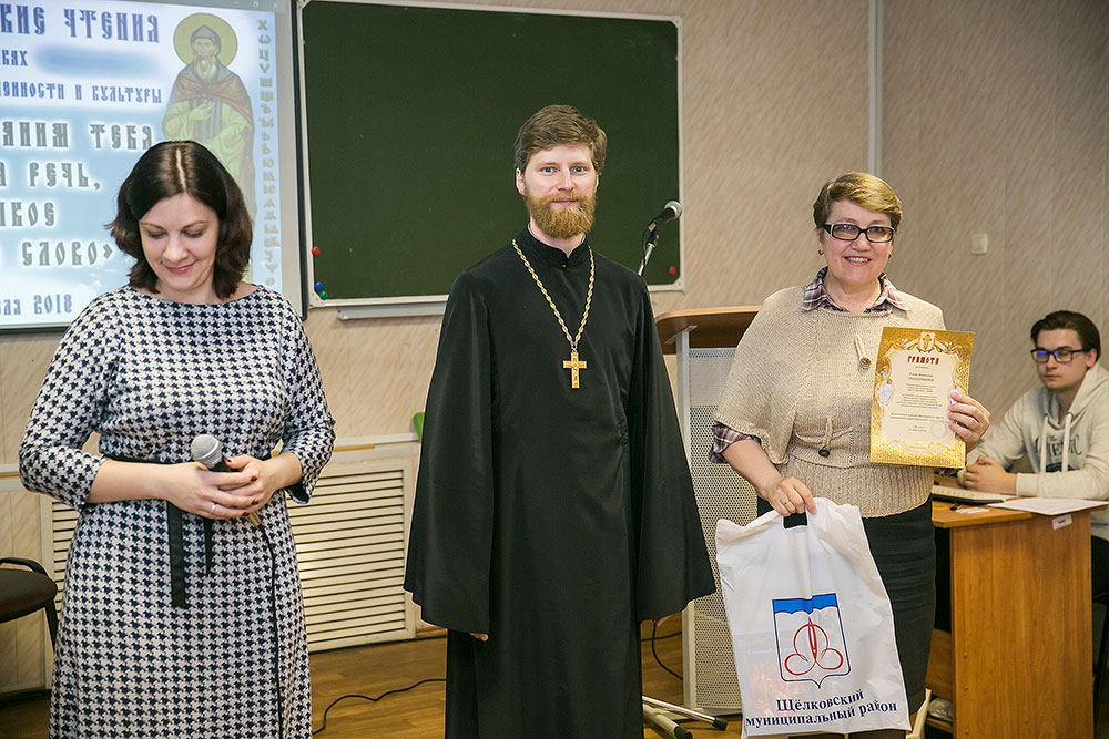 В ходе выступления отец Димитрий вручил Благословенную грамоту митрополита Крутицкого и Коломенского Ювеналия директору МБУ ДПО Учебно-методического образовательного центра ЩМР МО Зерковой Вере Алексеевне, Благодарственную грамоту митрополита Крутицкого и Коломенского Ювеналия руководителю районного методического объединения учителей основ православной культуры и Духовного краеведения Подмосковья Ефименко Валентине Ивановне, Благодарственные грамоты Щелковского благочиния учителю начальных классов МБОУ СОШ №16 Димитровой Татьяне Евгеньевне, учителю музыки и Духовного краеведения Подмосковья МБОУ Щёлковской гимназии Ерощенко Светлане Николаевне, учителю технологии АНОО «Православной классической Гимназии «Ковчег» Лыгиной Анне Викторовне, учителю музыки МБОУ Гребневской СОШ д. Ново Тарасовой Марине Геннадьевне, учителю начальных классов МБОУ Гребневской СОШ д. Ново Перебаскиной Александре Александровне, Коллективу МБДОУ д/с №27 «Берёзка» общеразвивающего вида.