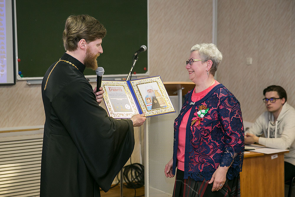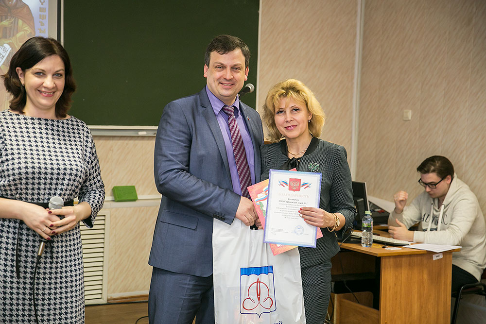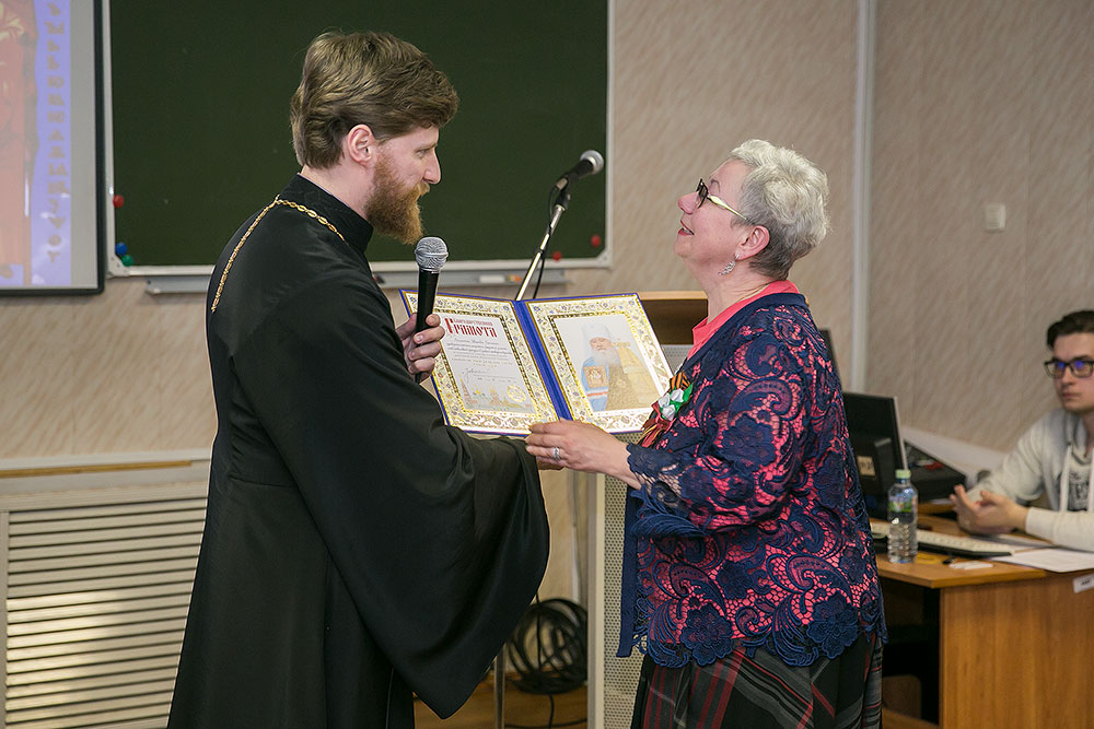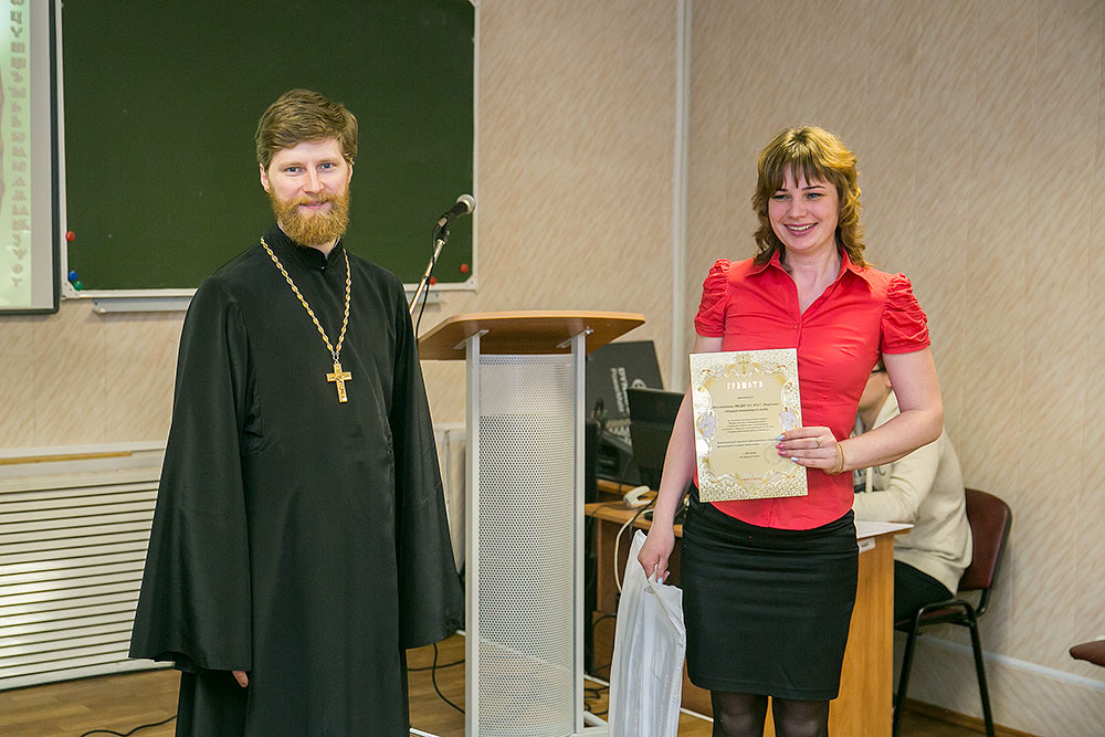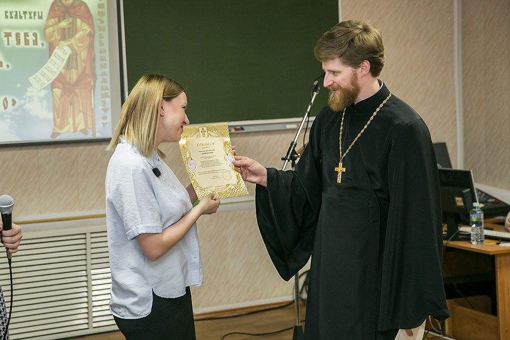 В ходе выступления отец Димитрий вручил Благословенную грамоту митрополита Крутицкого и Коломенского Ювеналия директору МБУ ДПО Учебно-методического образовательного центра ЩМР МО Зерковой Вере Алексеевне, Благодарственную грамоту митрополита Крутицкого и Коломенского Ювеналия руководителю районного методического объединения учителей основ православной культуры и Духовного краеведения Подмосковья Ефименко Валентине Ивановне, Благодарственные грамоты Щелковского благочиния учителю начальных классов МБОУ СОШ №16 Димитровой Татьяне Евгеньевне, учителю музыки и Духовного краеведения Подмосковья МБОУ Щёлковской гимназии Ерощенко Светлане Николаевне, учителю технологии АНОО «Православной классической Гимназии «Ковчег» Лыгиной Анне Викторовне, учителю музыки МБОУ Гребневской СОШ д. Ново Тарасовой Марине Геннадьевне, учителю начальных классов МБОУ Гребневской СОШ д. Ново Перебаскиной Александре Александровне, Коллективу МБДОУ д/с №27 «Берёзка» общеразвивающего вида.