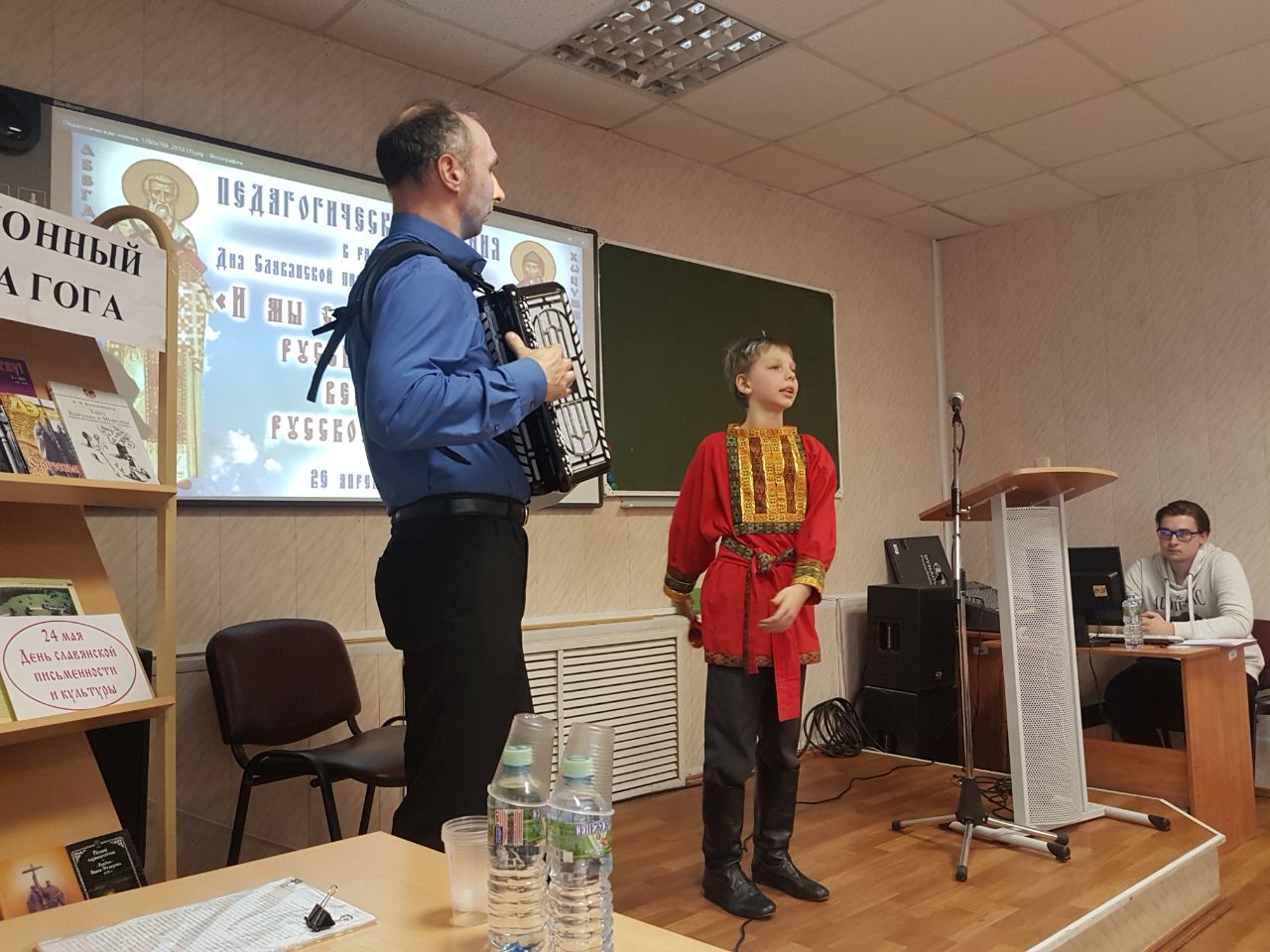 Педагогические чтения украсило выступление обучающихся МБОУ Щелковской гимназии с литературной композицией «Я кланяюсь тебе по-русски, язык прапрадедов моих», ансамбля «Менестрели» обучающихся МБОУ СОШ № 16 с песней «О России» и выступление солистов детского фольклорного ансамбля «Затея» Борисова Арсения и Роговой Дианы, обучающихся МАУДО Детской школы искусств имени Юрия Розума.