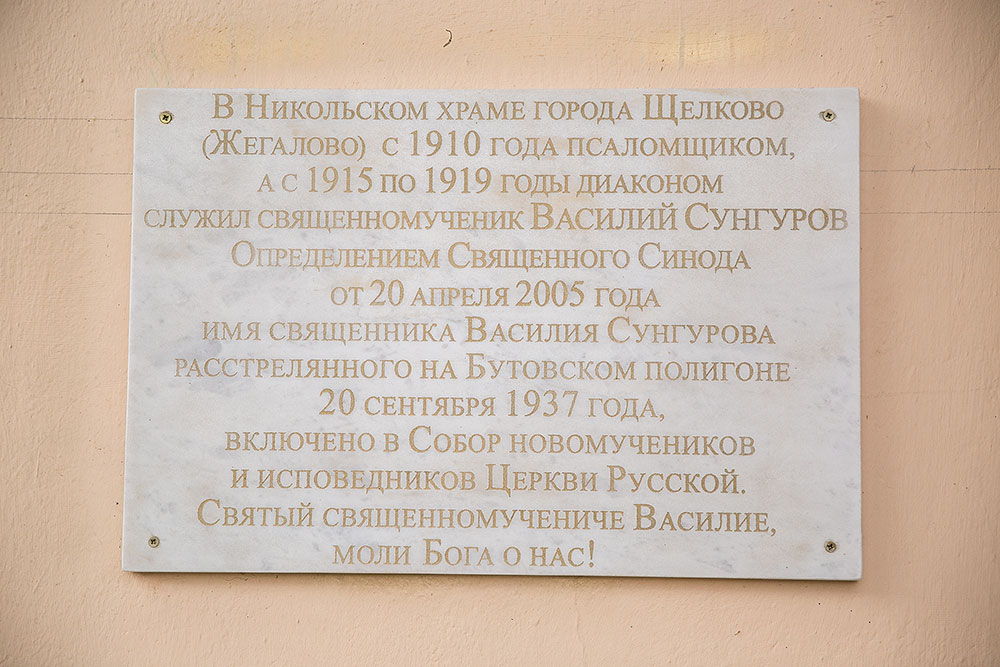 22 мая, в престольный праздник Никольского храма г. Щелково после Божественной литургии, которую возглавил благочинный Щелковского церковного округа протоиерей Андрей Ковальчук в сослужении настоятеля храма протоиерея Олега Лахманюка и клириков благочиния, состоялось открытие памятной доски в память священномученика Василия Сунгурова, который служил в этом храме с 1910 по 1919 годы.