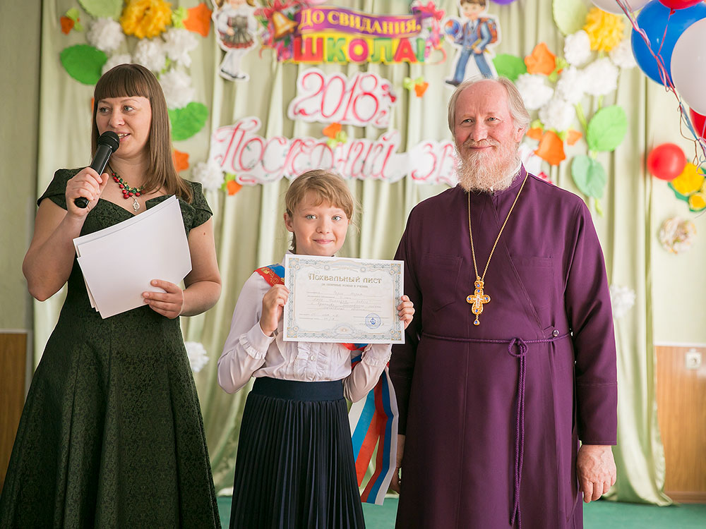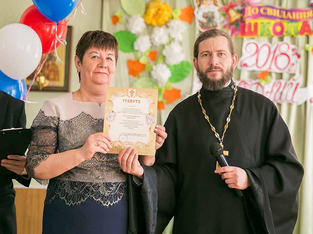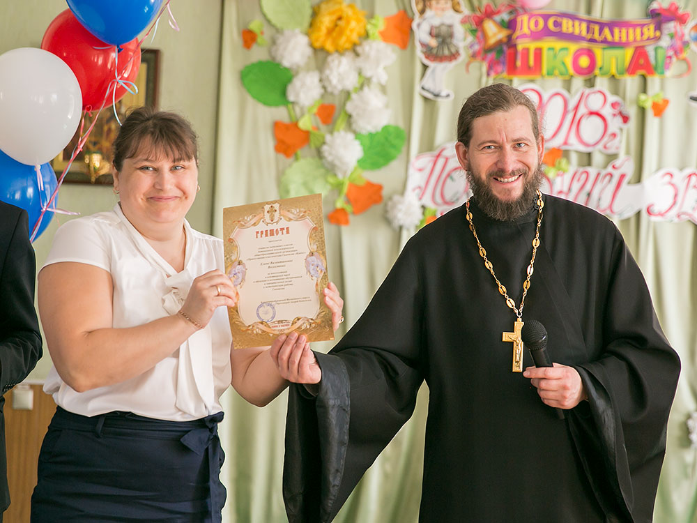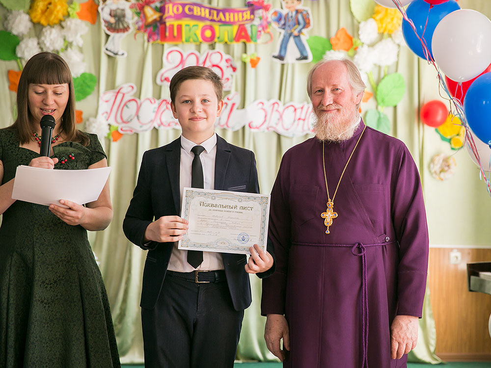 Благочинный церквей Щелковского округа протоиерей Андрей Ковальчук поздравил выпускников, отметил их многолетние творческие таланты и пожелал Божьего благословения на новом жизненном пути. Ребята получили в подарок настольный календарь «От Пасхи до Пасхи». Также были вручены благодарственные грамоты ученикам и классным руководителям выпускников.