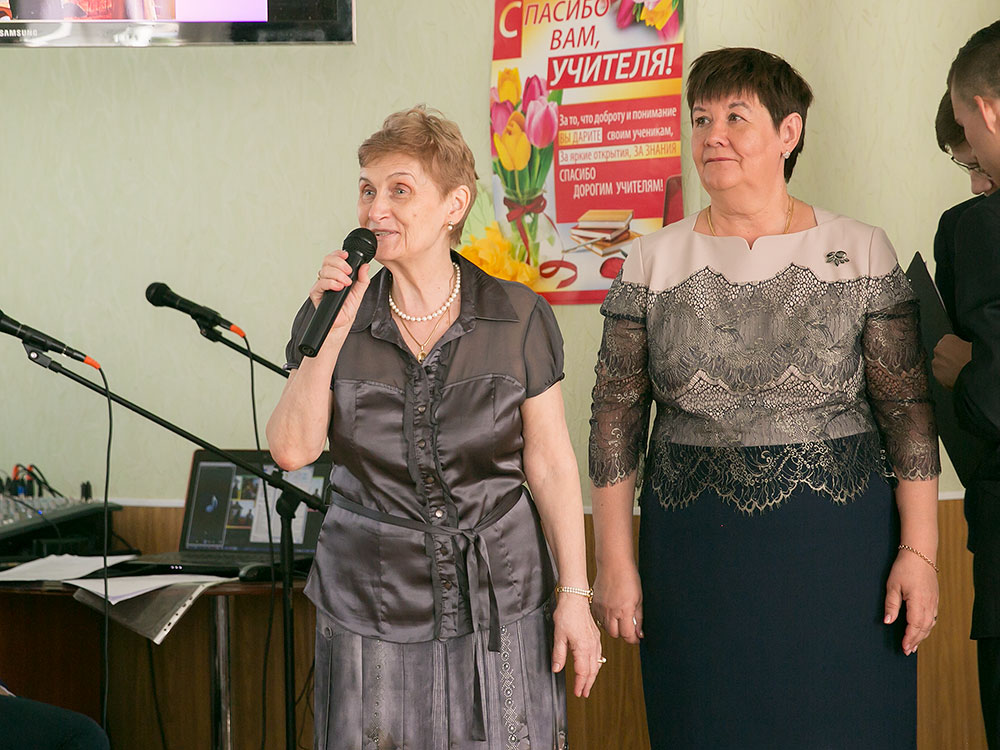 Девятиклассники и одиннадцатиклассники прочитали благодарственные стихи учителям, вручили букеты цветов, подарили несколько песен.