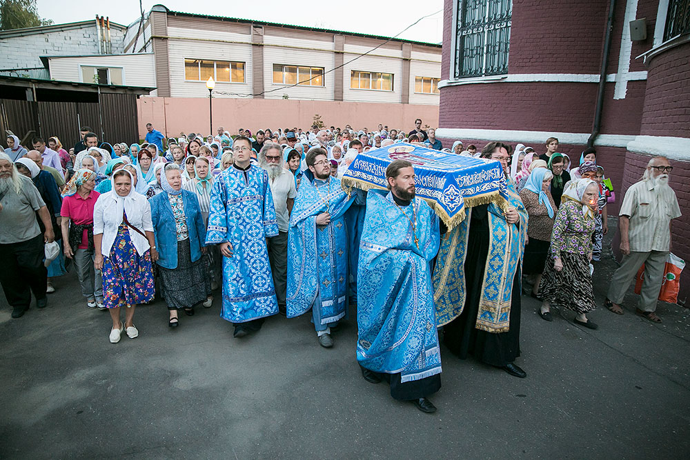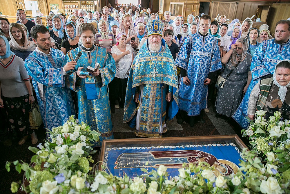Для Троицкого собора г. Щелкова это престольный праздник, так как правый предел этого храма посвящен этому событию. Накануне, 27 августа, было совершено торжественное Всенощное бдение с чином Погребения Божией Матери. После великого славословия духовенство храма торжественно обнесло Плащаницу с изображением Богоматери вокруг храма. 28 августа, в самый день праздника, была совершена Божественная Литургия. Богослужение возглавил настоятель Троицкого собора и благочинный Щелковского церковного округа протоиерей Андрей Ковальчук. По окончании Литургии был совершен крестный ход вокруг храма. После крестного хода отец Андрей обратился к прихожанам со словами поздравления с престольным праздником.