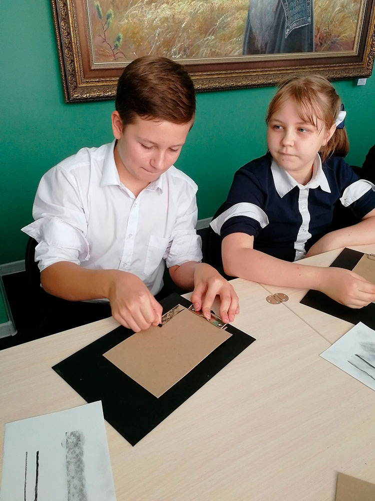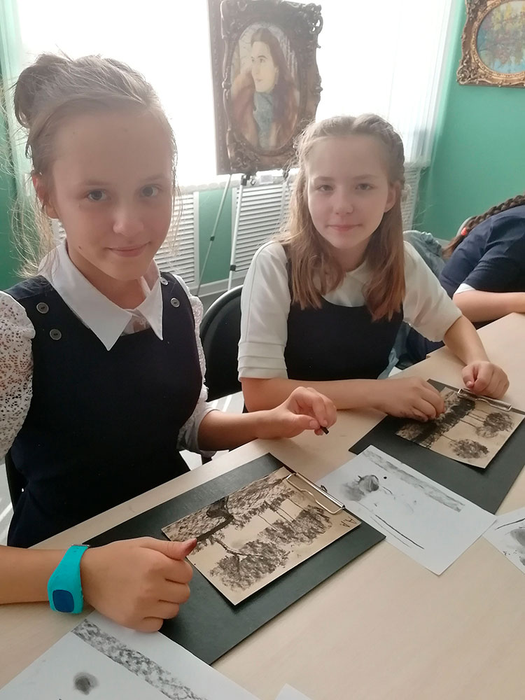 После окончания экскурсии для ребят был проведен мастер–класс «Рисование углем». Наталья Владимировна показала технику рисования, объяснила, как нужно рисовать деревья, лес, реку. Ребята повторили её действия и создали свои картины, которые отличались индивидуальностью и неповторимостью. Эта работа принесла детям удовлетворение и огромную радость.
