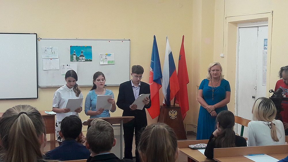 В качестве гостя и участника на урок был приглашен настоятель Богородицерождественского храма священник Димитрий Выдумкин. Ученики 8 класса рассказали историю создания храма, чередуя свой рассказ видеосюжетами, записанными в храме в Образцово.