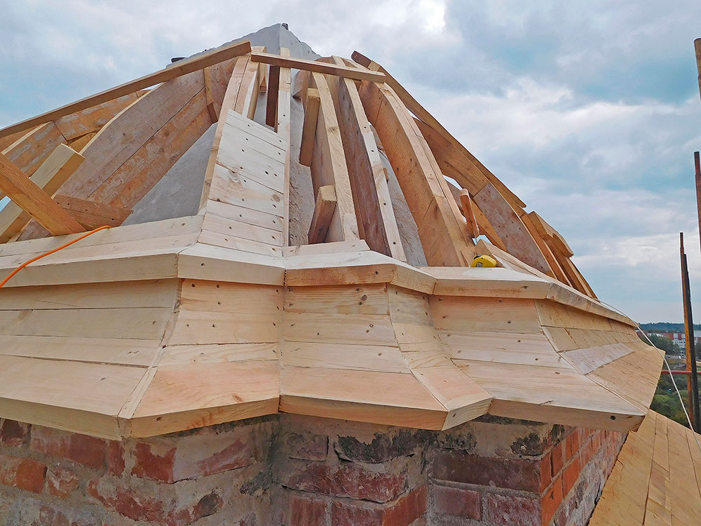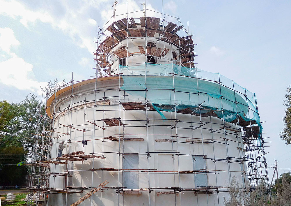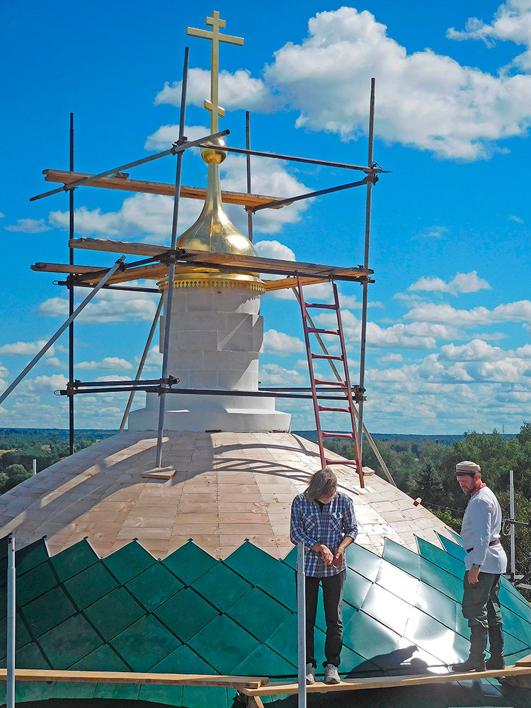 Работа продолжается ежедневно за исключением выходных и праздничных дней. В августе уже освятили и подняли крест на главный купол восстанавливаемого храма.