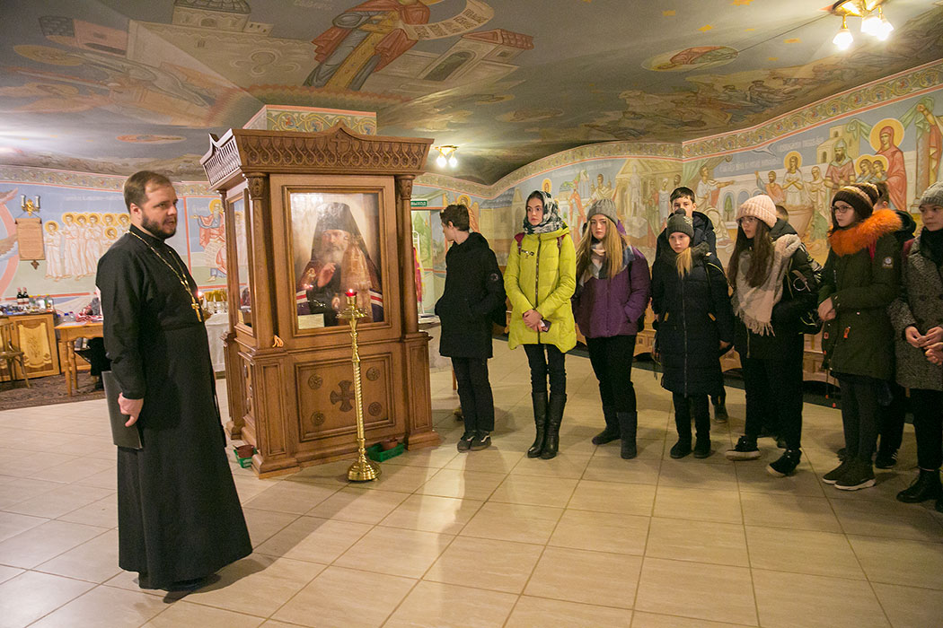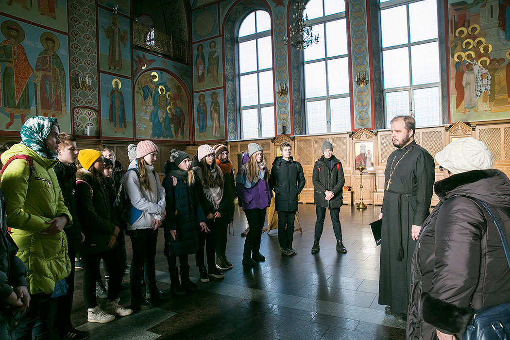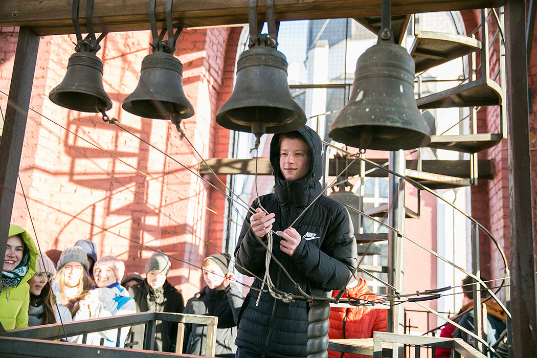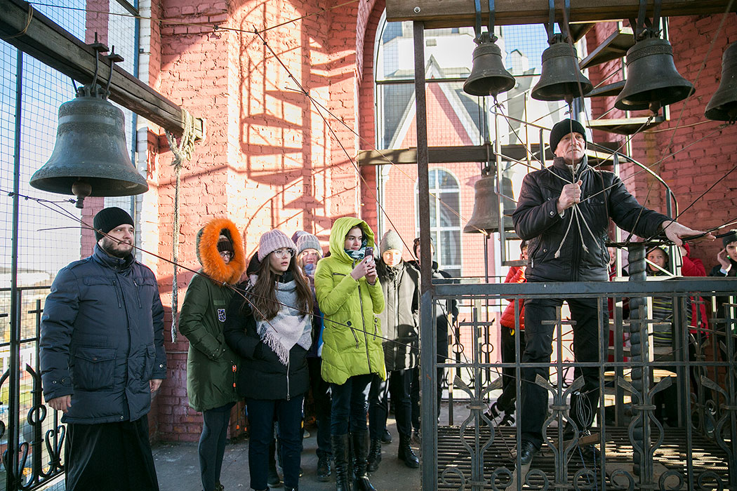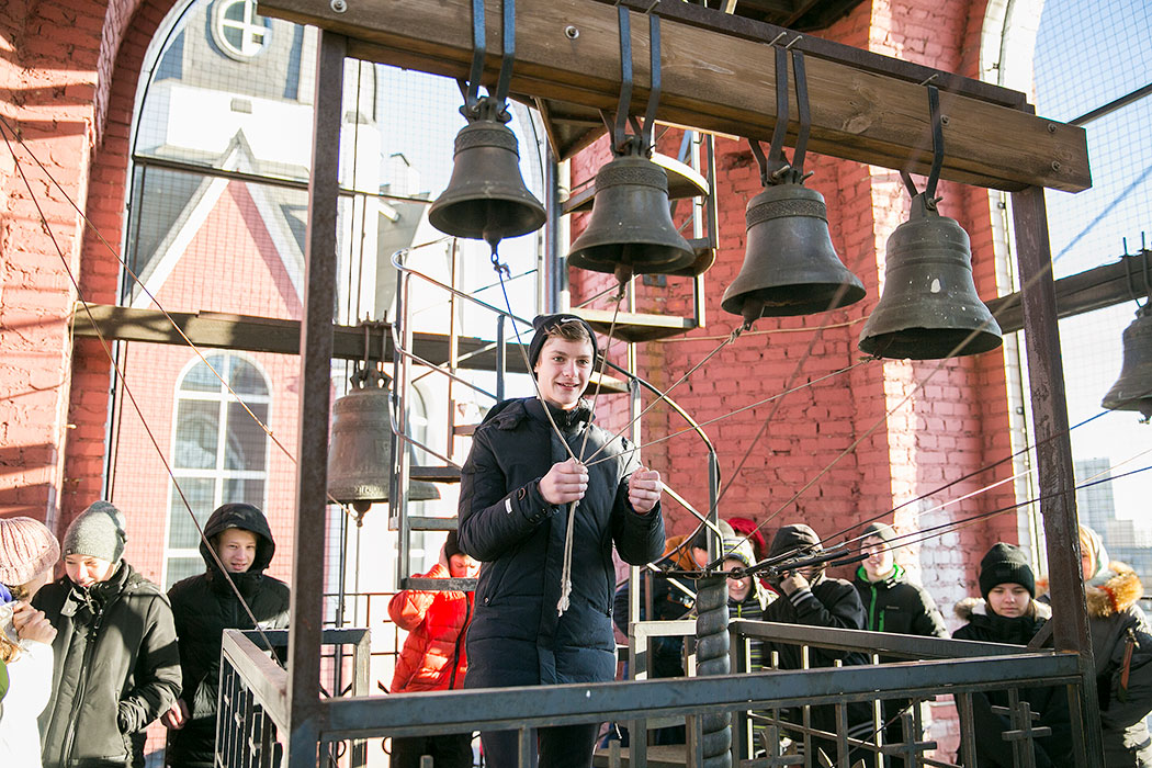 Батюшка рассказал ребятам историю создания и восстановления Троицкого собора. Гости осмотрели собор и нижний храм в честь мучениц Веры Надежды, Любови и матери их Софии. Также ребята поднялись на колокольню, где они увидели работу звонаря, услышали колокольный звон и смогли сами позвонить в колокола.