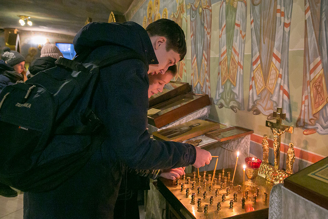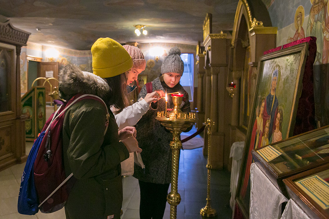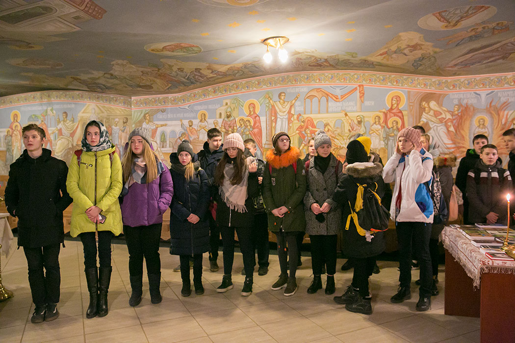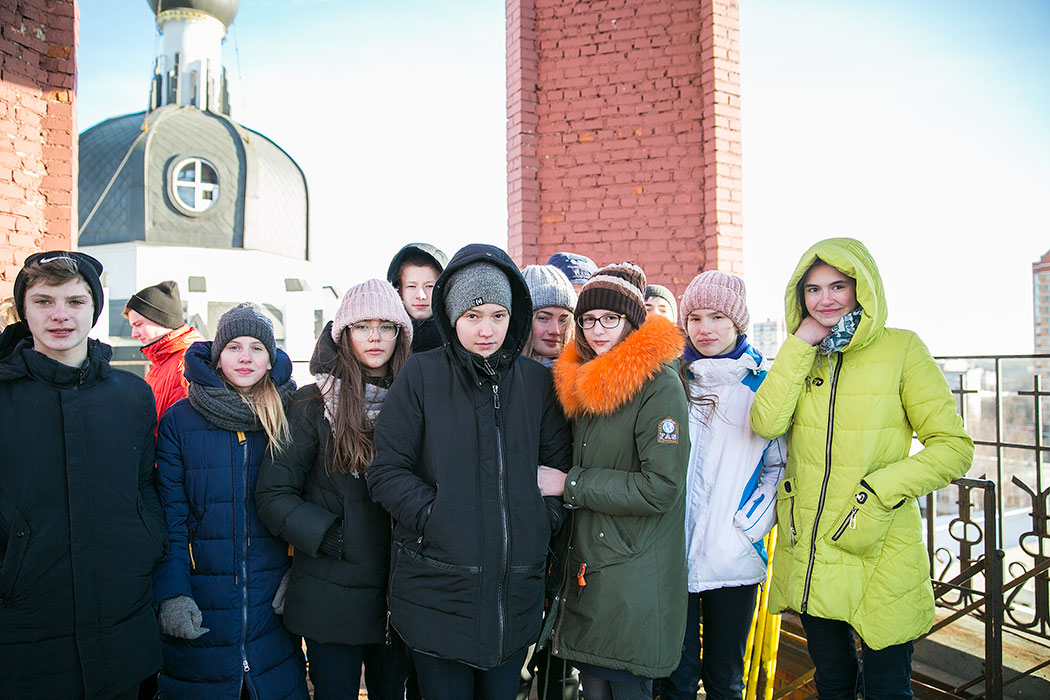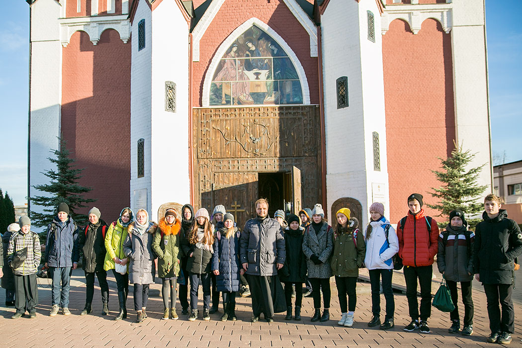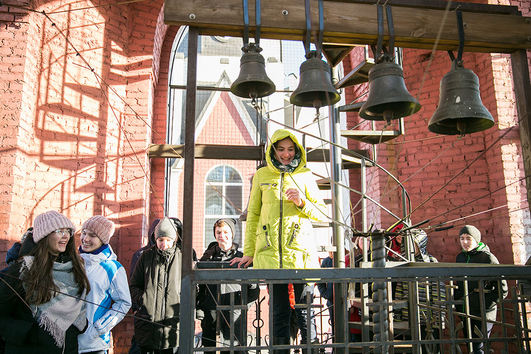 Батюшка рассказал ребятам историю создания и восстановления Троицкого собора. Гости осмотрели собор и нижний храм в честь мучениц Веры Надежды, Любови и матери их Софии. Также ребята поднялись на колокольню, где они увидели работу звонаря, услышали колокольный звон и смогли сами позвонить в колокола.
