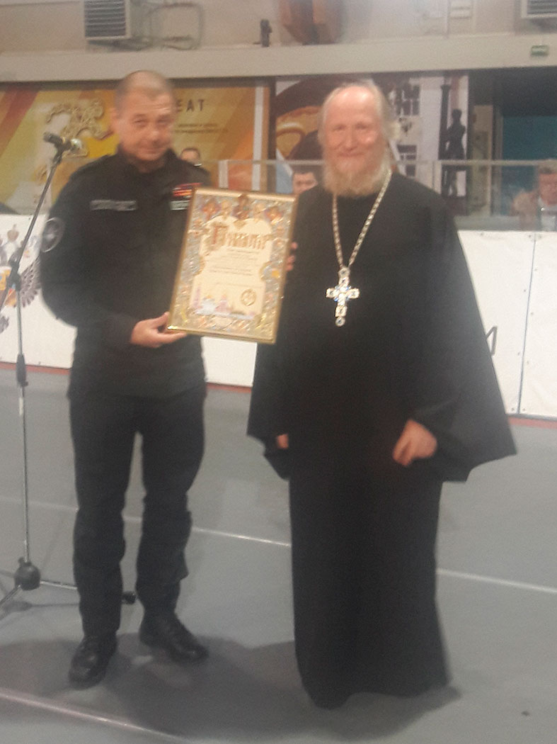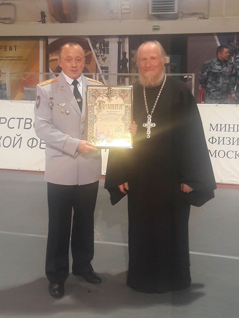 Поздравив всех юбиляров с праздником, отец Андрей вручил Благословенные грамоты митрополита Крутицкого и Коломенского Ювеналия Начальнику Центра специального назначения сил оперативного реагирования и авиации полковник полиции С.Д. Буракову и его первому заместителю полковнику полиции Н.В. Черторижскому.