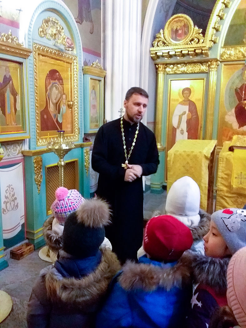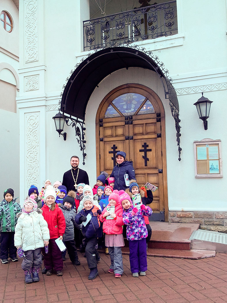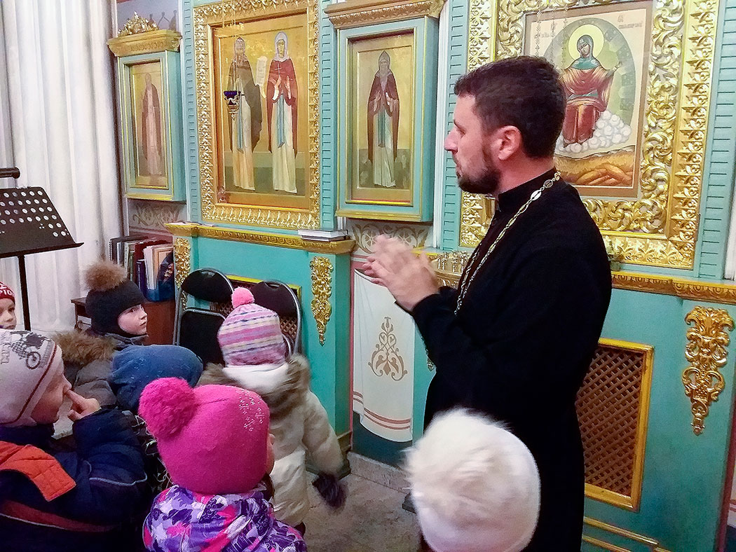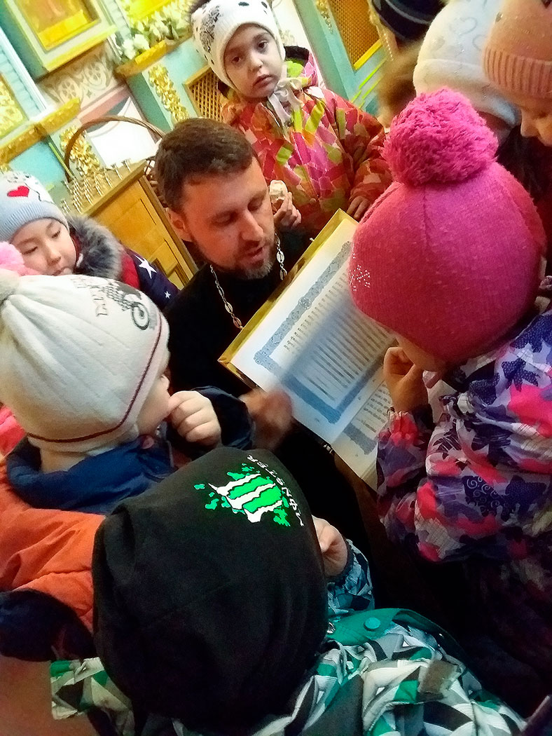 Настоятель храма иерей Александр Мороков провёл для детей экскурсию, познакомил малышей с главными иконами храма, рассказал о выпечке просфор, а также познакомил детей с Богослужебным Евангелием и церковно-славянским текстом. После экскурсии отец Александр угостил детей просфорами и подарил памятные подарки.