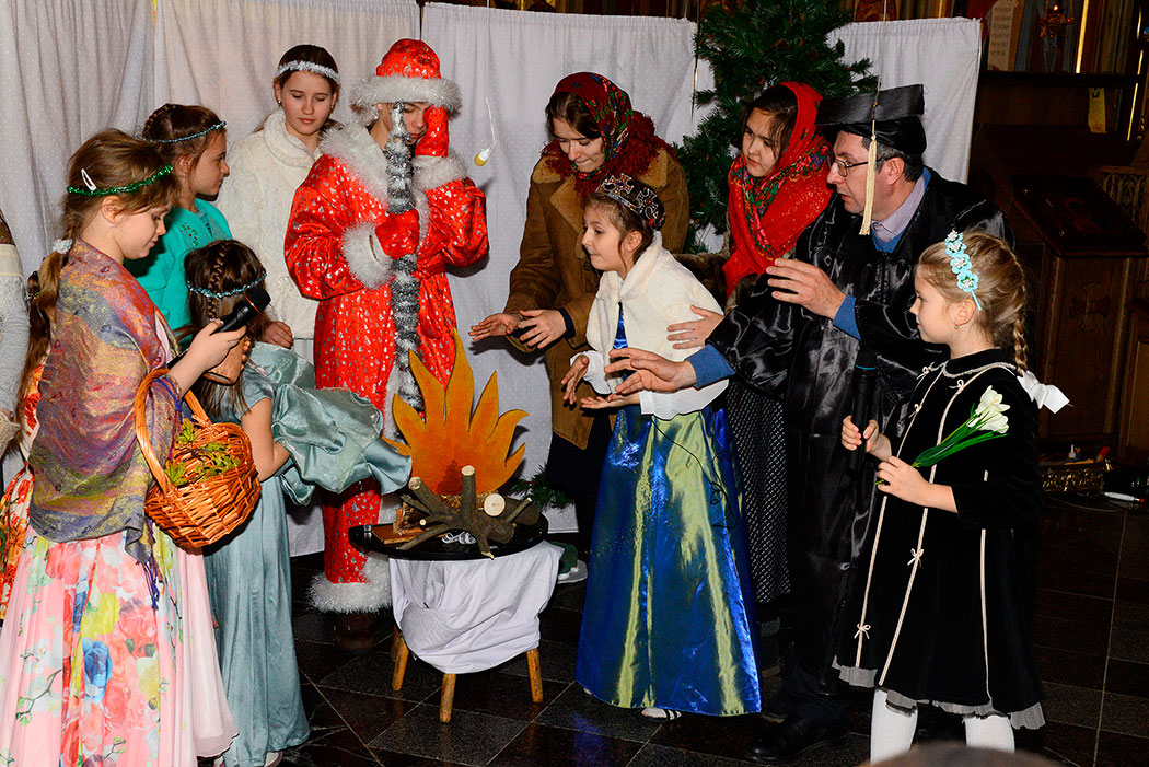 Во время спектакля прозвучали рождественские колядки в исполнении хора Воскресной школы. С приветственным словом перед ребятами выступил настоятель храма священник Илия Плешаков.