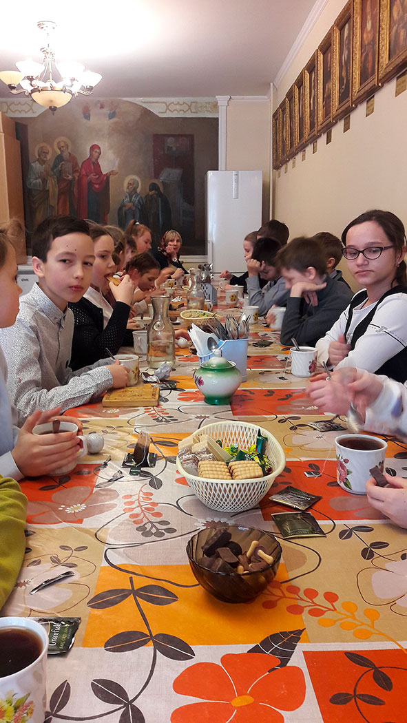 Экскурсию провел настоятель храма священник Димитрий Выдумкин. Рассказав ученикам о правилах поведения в храме, отец Димитрий кратко коснулся истории создания храма, рассказал о некоторых древних иконах храма и святых мощах. "Изюминкой" экскурсии стало восхождение на колокольню, где каждый мог попробовать свои силы в роли звонаря. По окончании экскурсии батюшка с педагогами и учениками отправились в трапезную, где общение было продолжено за чаепитием.