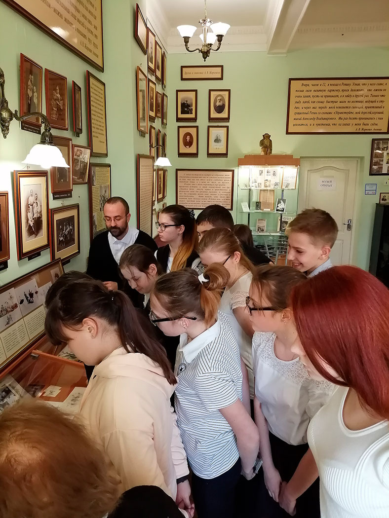 В беседе приняли участие учитель истории Т.А. Балыко, настоятель Сергиевского храма с. Трубино священник Антоний Сенько и участники исторического кружка 16-й школы г. Щелково. Ведущая беседы Н.Г. Жиркевич познакомила гостей с историей семьи Жиркевичей, семейных досуговых традиций, совместных игр. Ребята активно участвовали в беседе, задавали непростые вопросы. В заключении беседы ознакомились с образцами писем конца 19-го начала 20-го столетий и пропели вместе небольшую детскую песню.