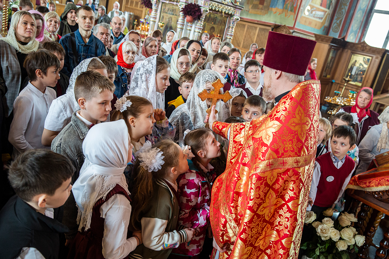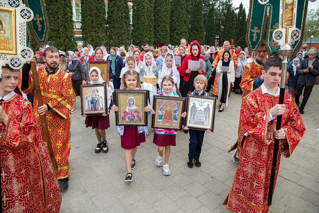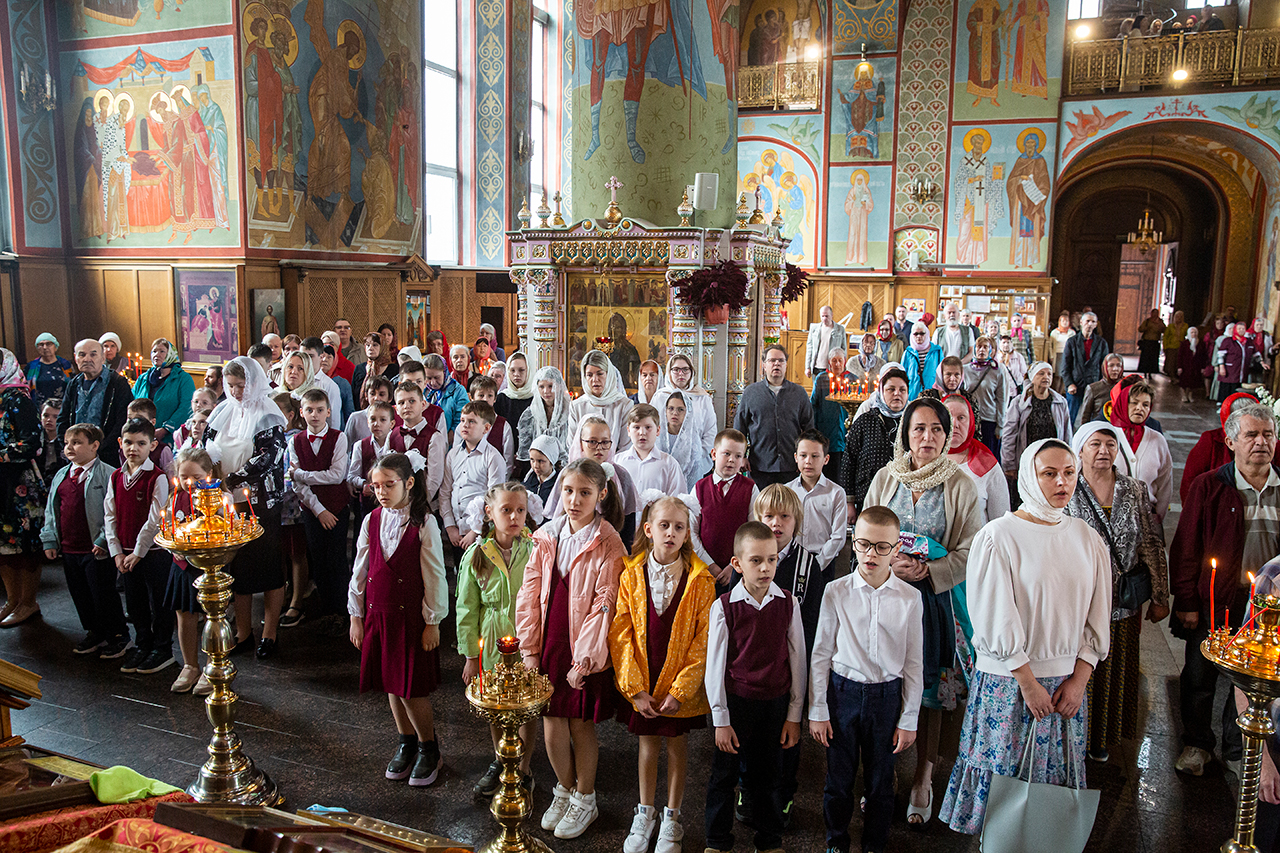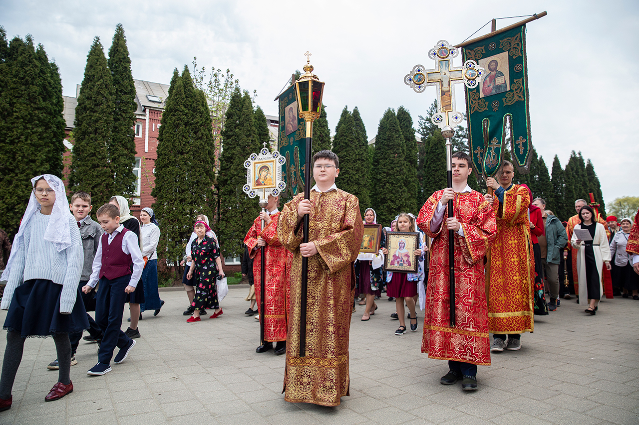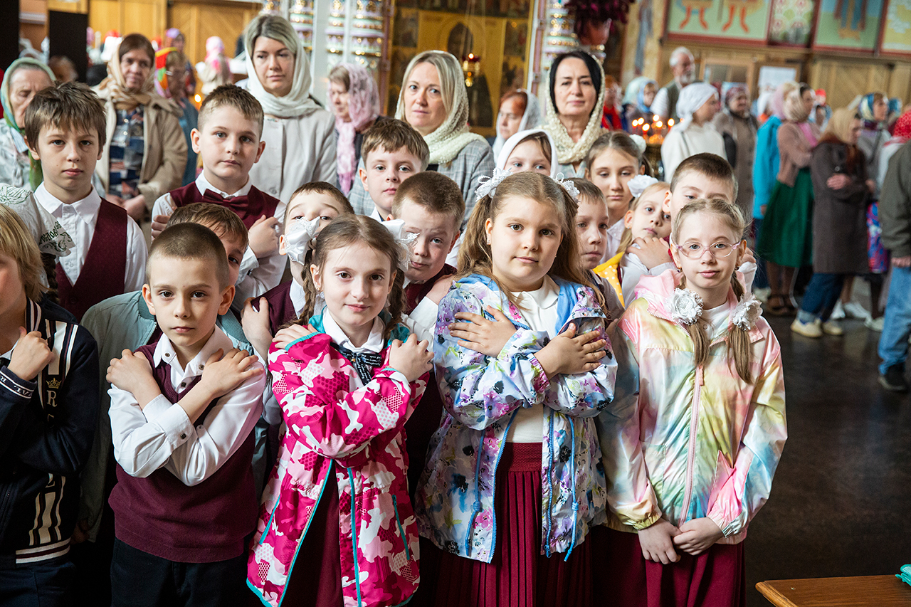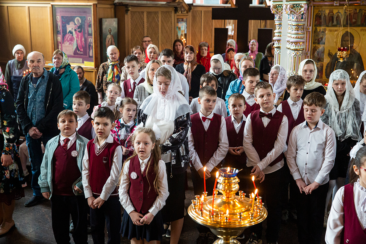 Ребята с учителями посетили Божественную литургию, где приобщились Святых Христовых Таин. После службы все гимназисты приняли участие в пасхальном крестном ходе. Некоторые из учеников и учителей были привлечены к ношению икон и артосов.