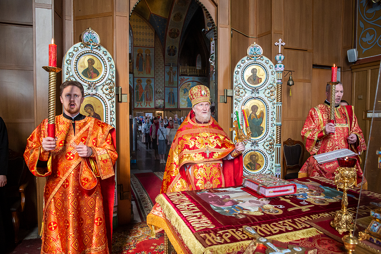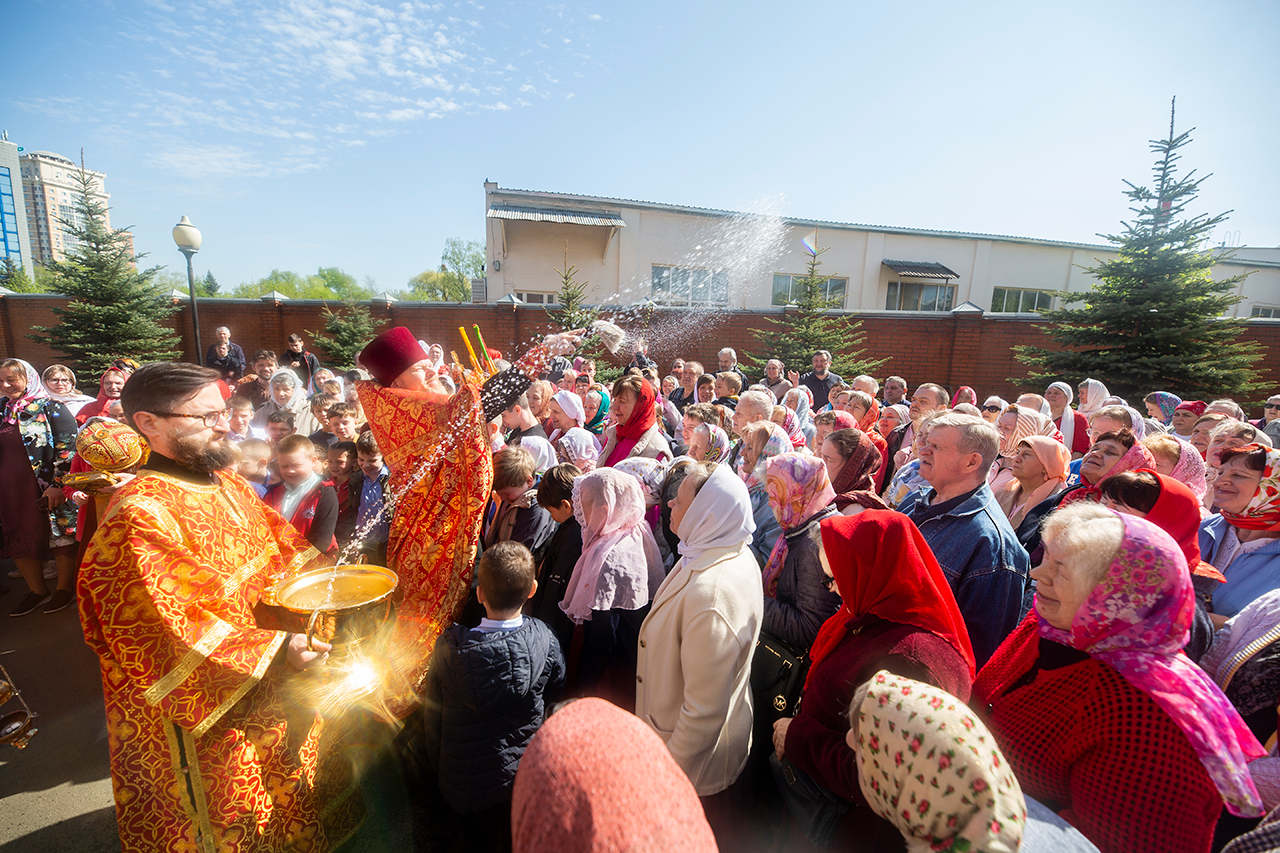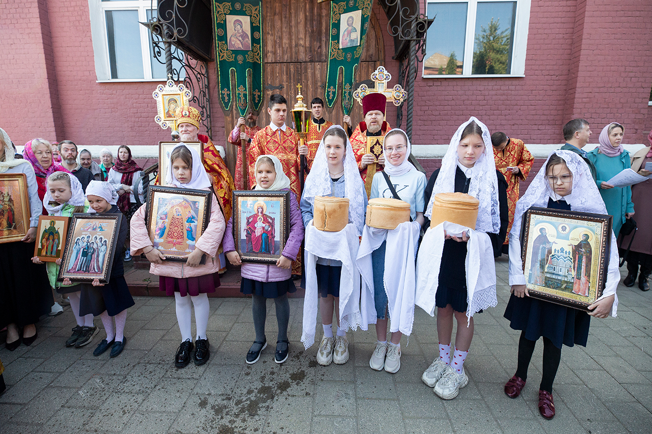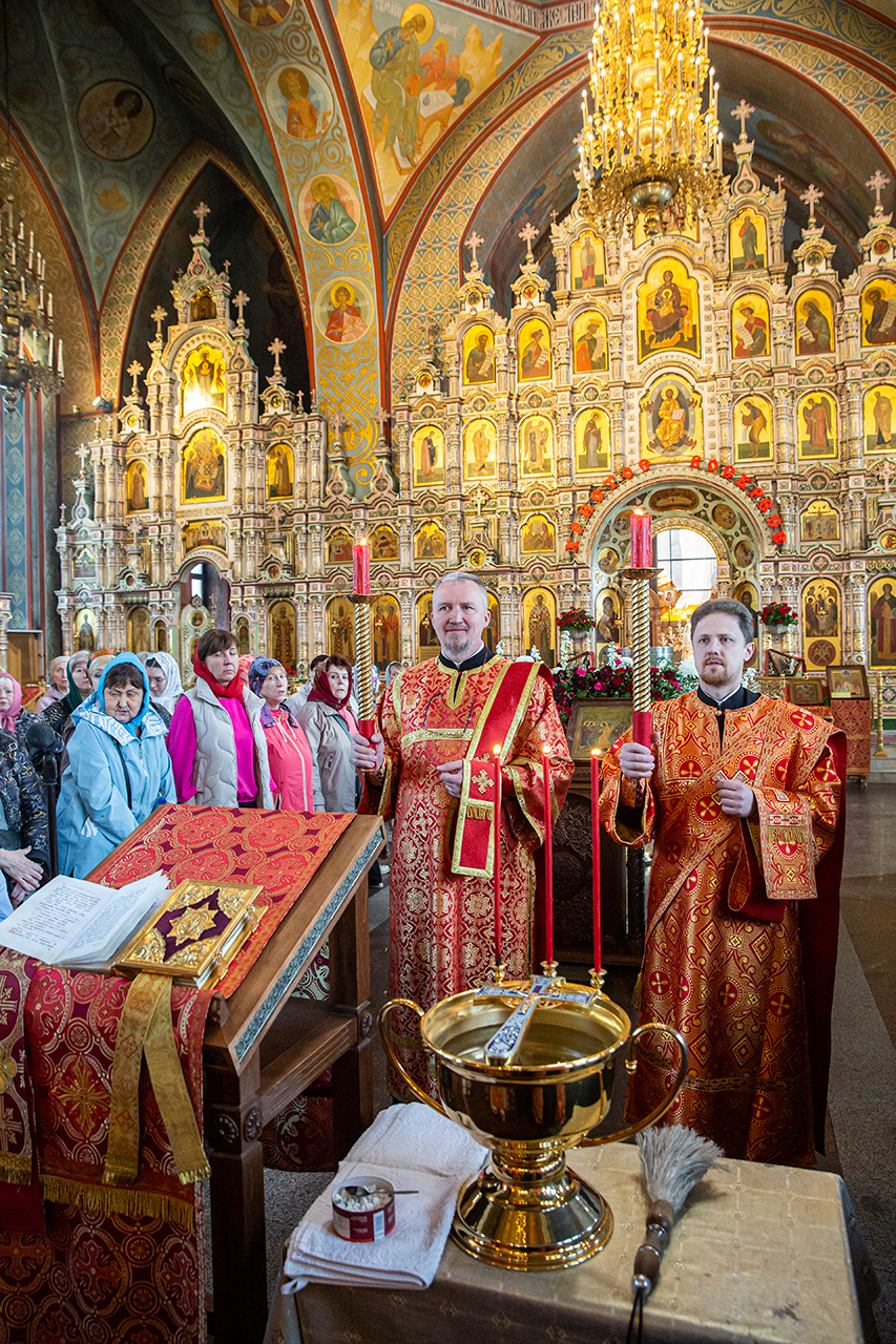 По окончании Литургии отец Андрей совершил водосвятный молебен, после чего возглавили крестный ход вокруг собора.