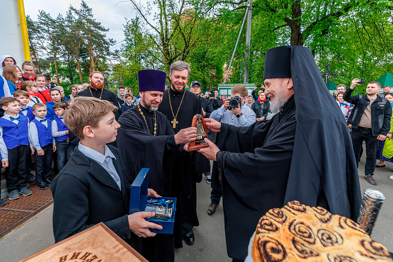 Молодые люди Балашихинской епархии возгласом «Христос Воскресе» приветствовали прибывшего в Никольский храм епископа Николая, преподнесли ему каравай и памятные подарки.