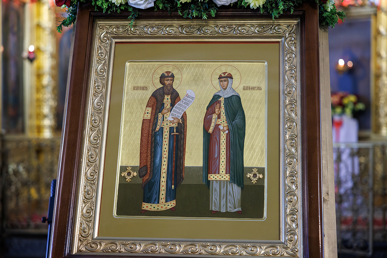 Затем владыка Николай возглавил всенародное акафистное пение перед иконой святых покровителей семьи с частицей их мощей.