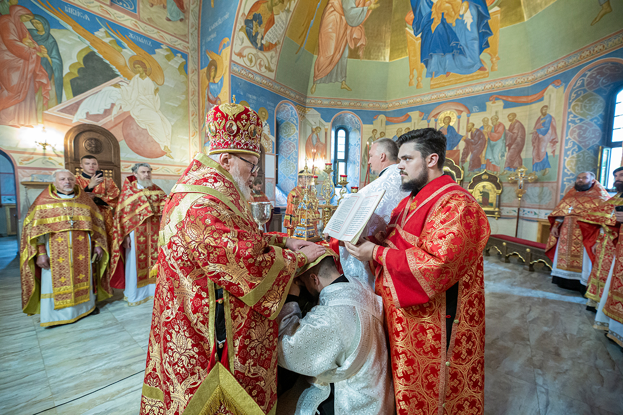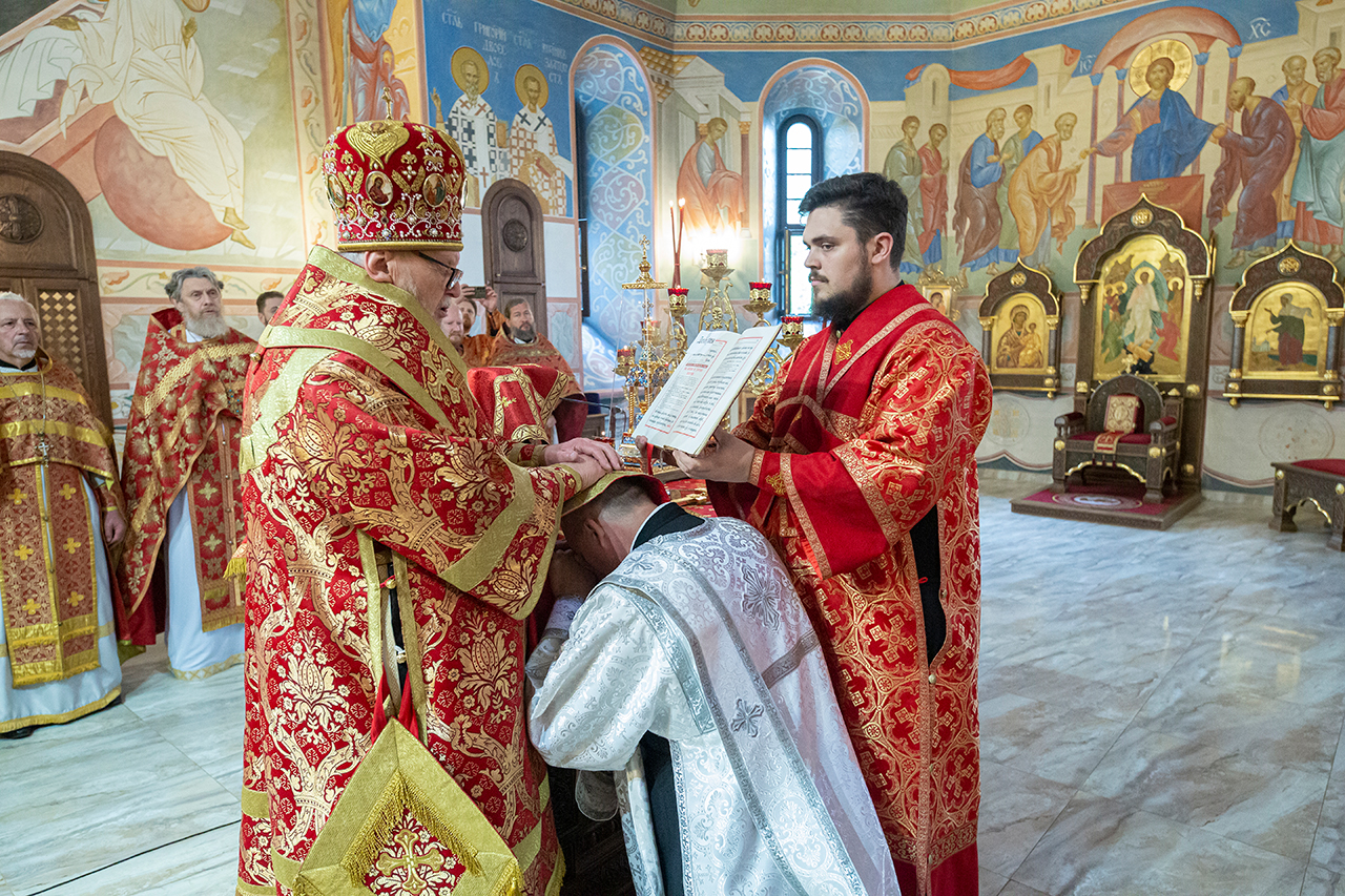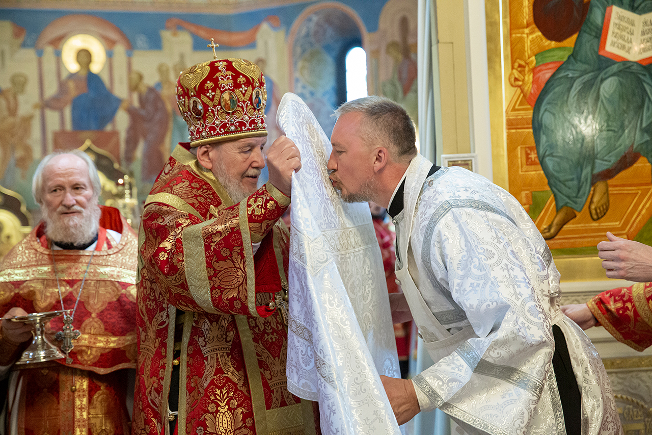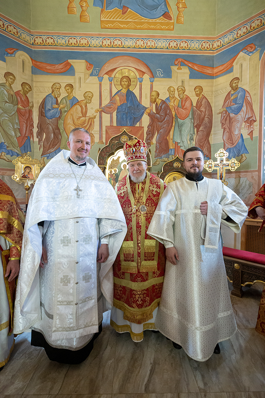 За богослужением была совершена священническая хиротония клирика Троицкого собора города Щёлково диакона Димитрия Задорожного и диаконская хиротония алтарника Троицкого собора города Щёлково Сергия Пейогло.