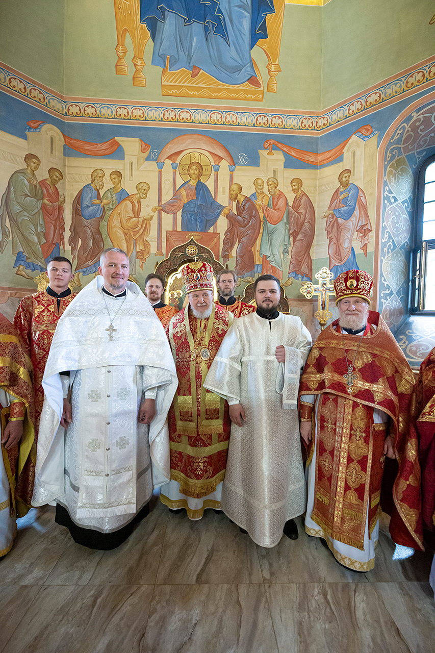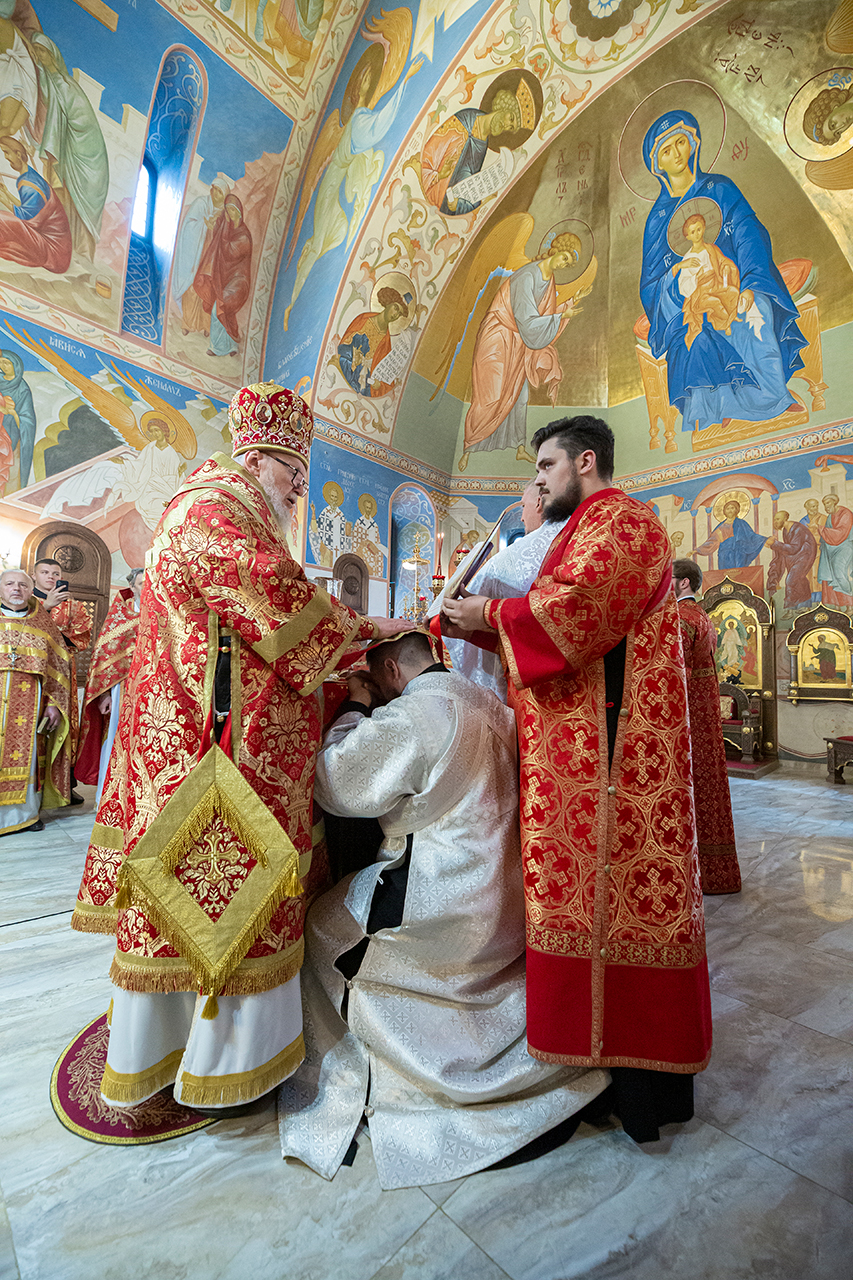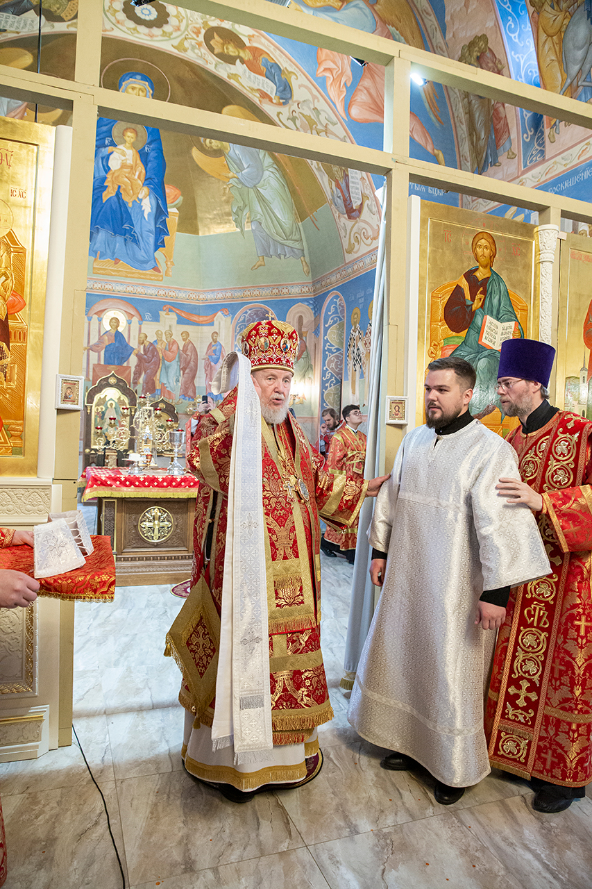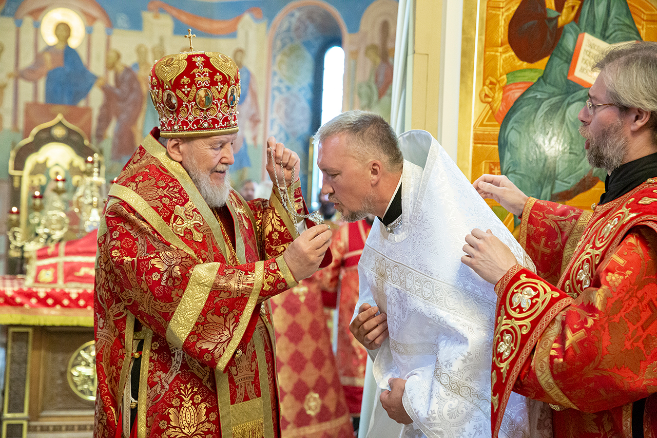 За богослужением была совершена священническая хиротония клирика Троицкого собора города Щёлково диакона Димитрия Задорожного и диаконская хиротония алтарника Троицкого собора города Щёлково Сергия Пейогло.