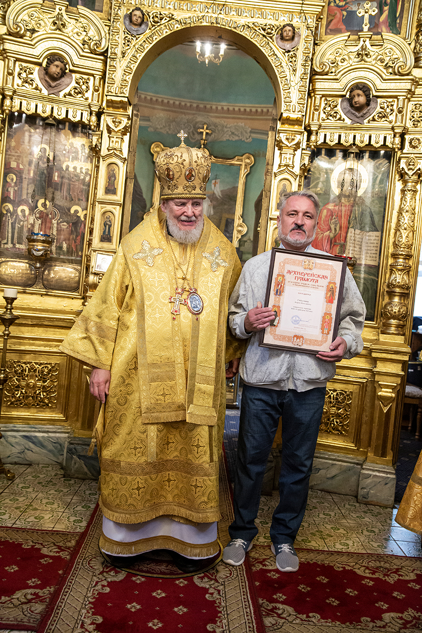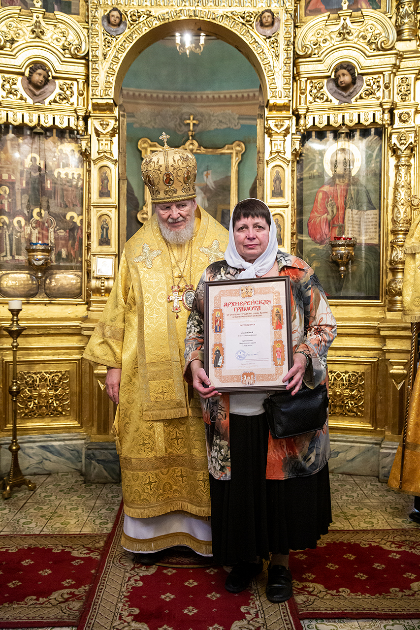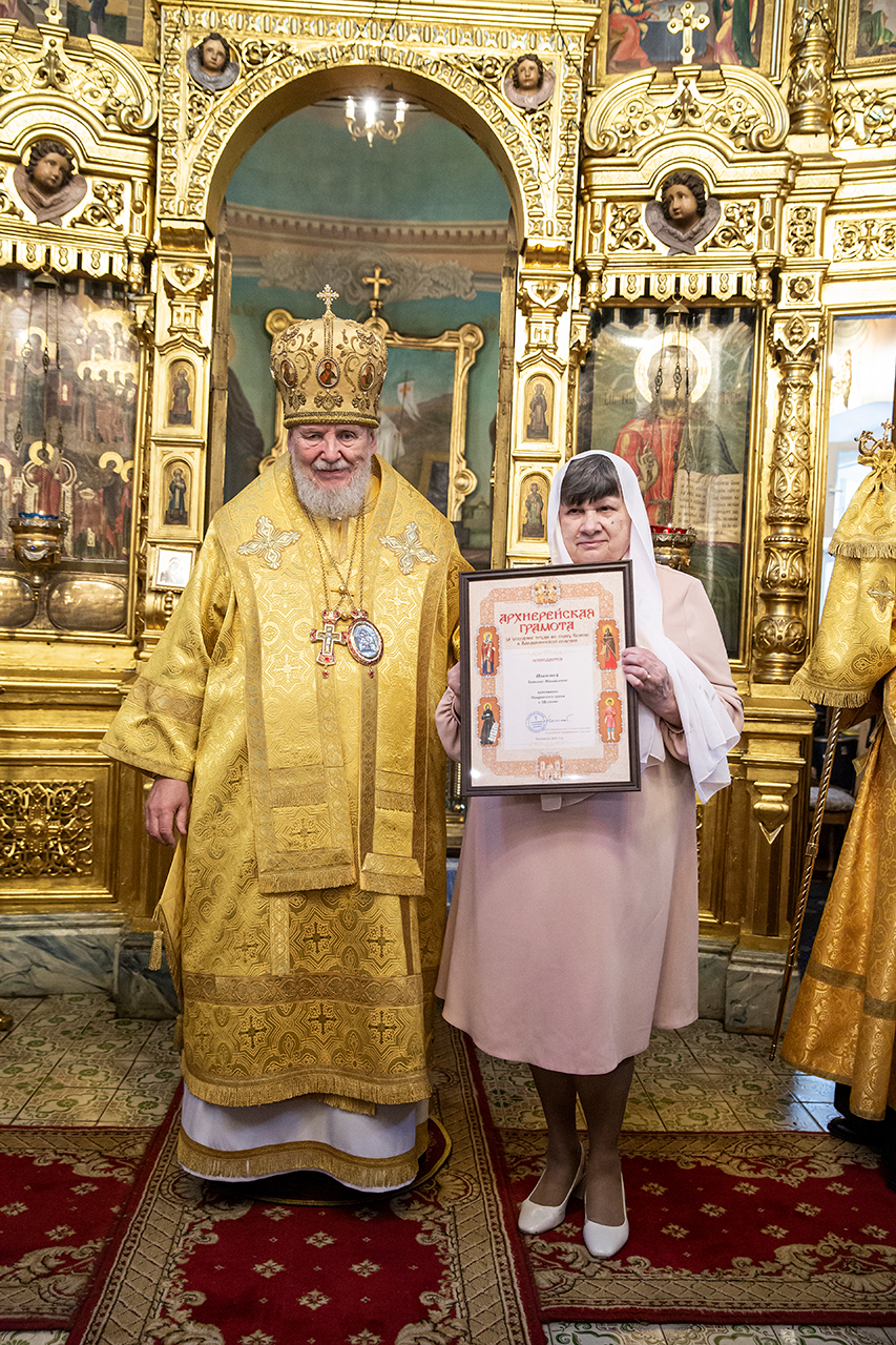 Затем Владыка обратился к духовенству и молящимся с архипастырским словом и вручил архиерейские грамоты Балашихинской епархии сотрудникам прихода.