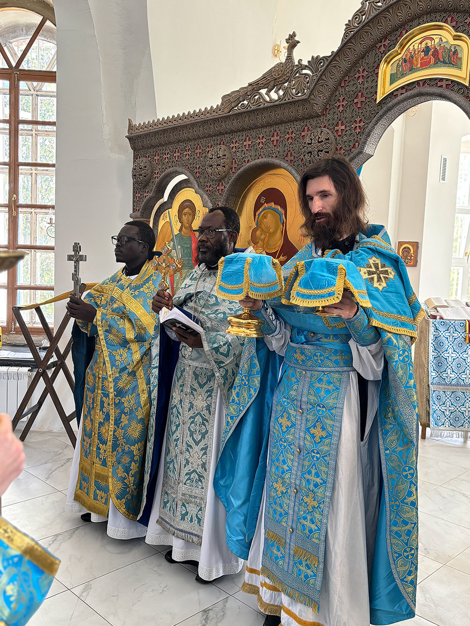 14 сентября в Казанский храм деревни Богослово приехали священники из Африки – отец Стефан из Нигерии и отец Виктор из Уганды. Их недавно рукоположили в Москве, и они служили сорокоуст.