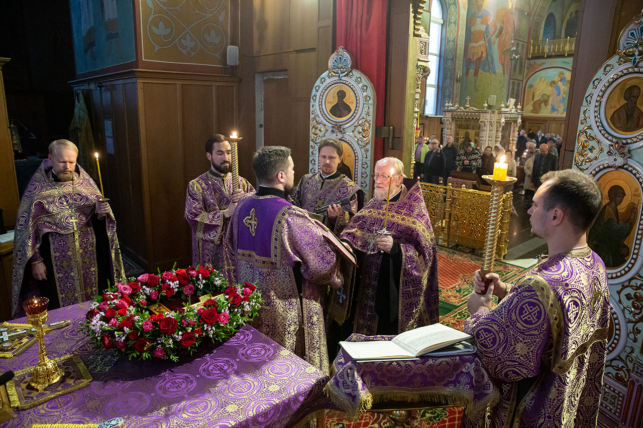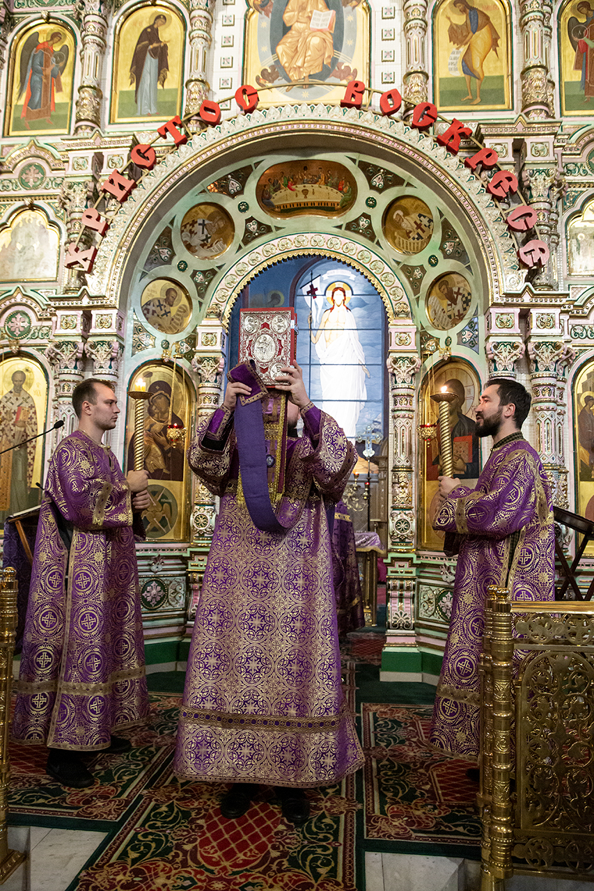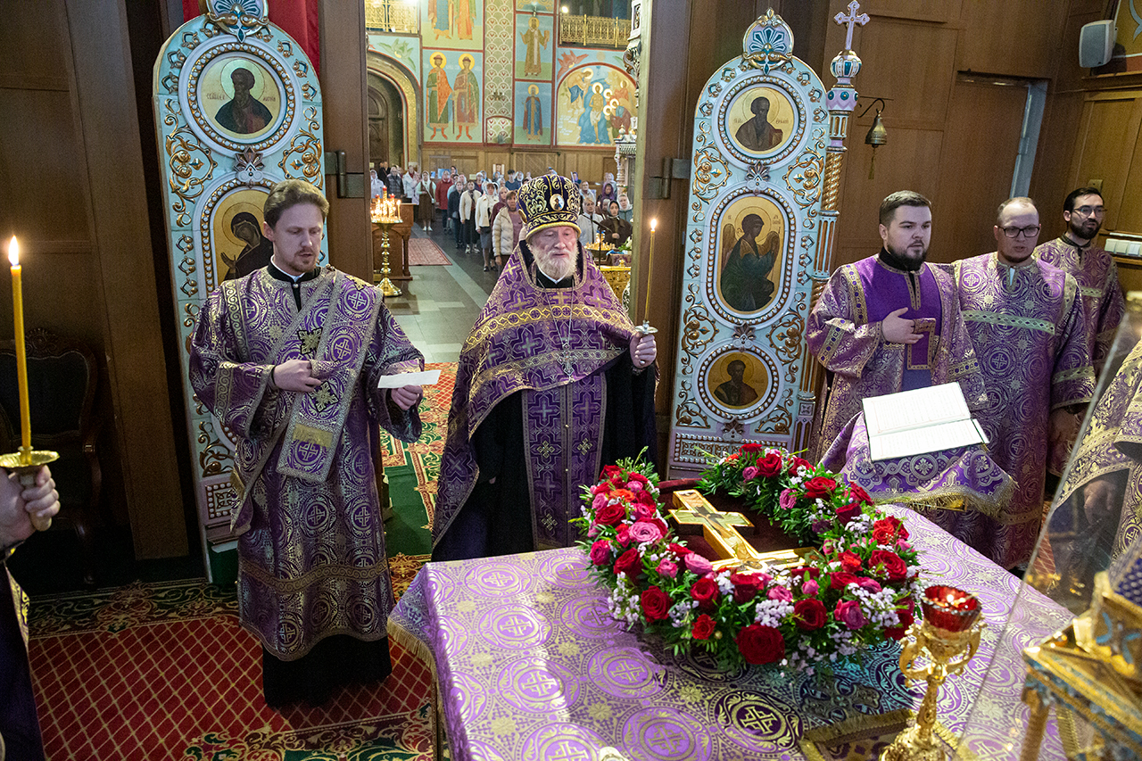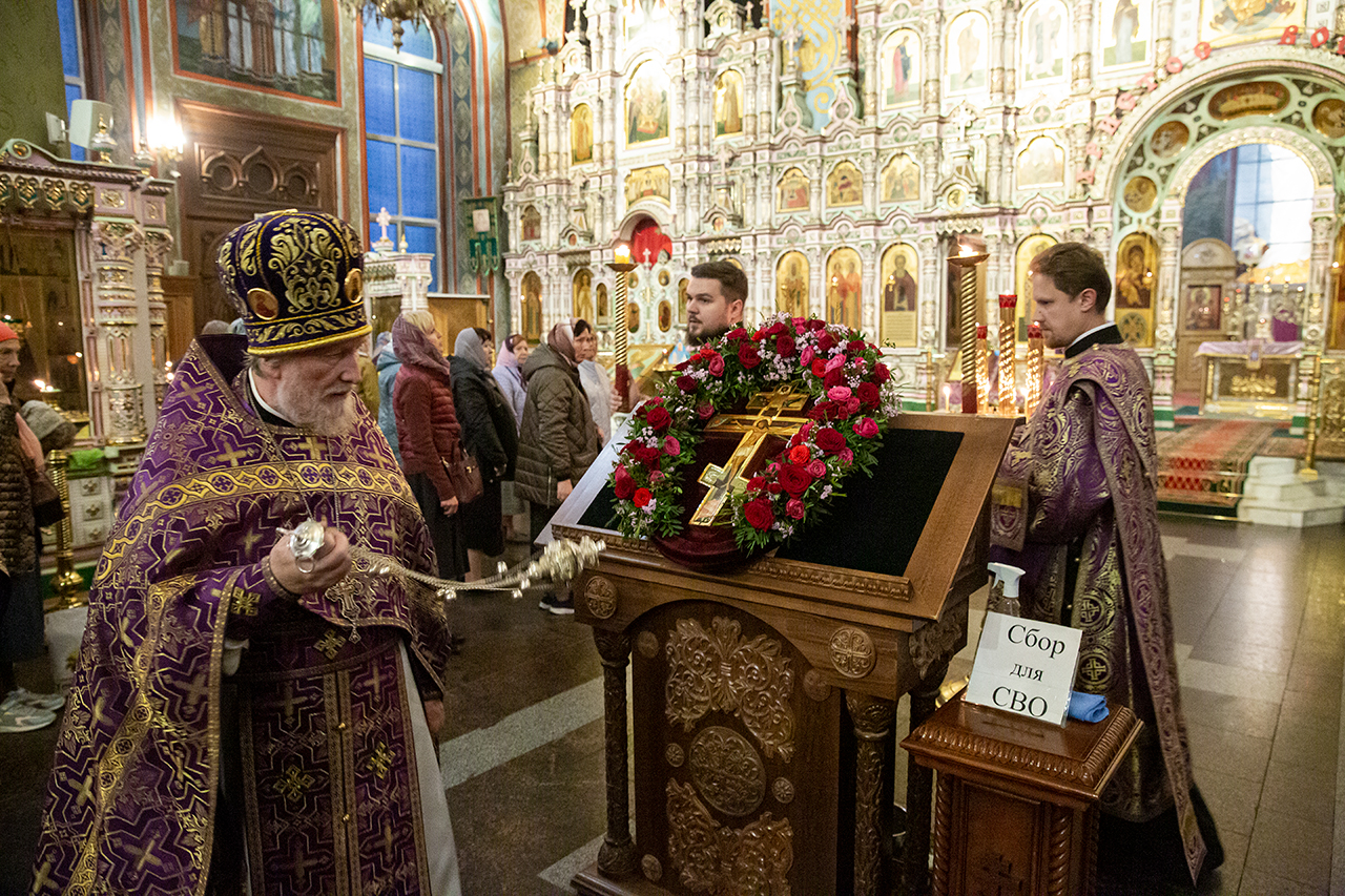 Во время богослужения для всенародного поклонения из Алтаря на праздничный аналой в центр храма был вынесен Крест Господень.