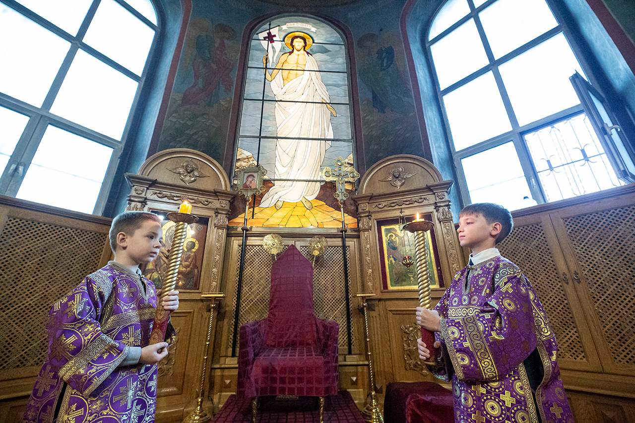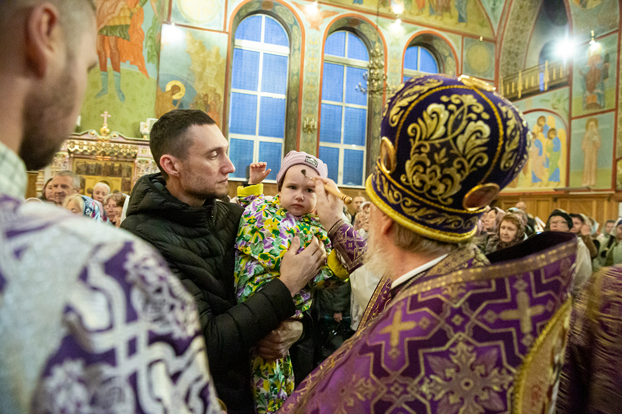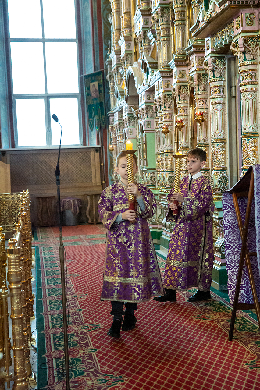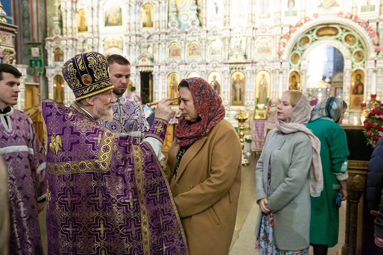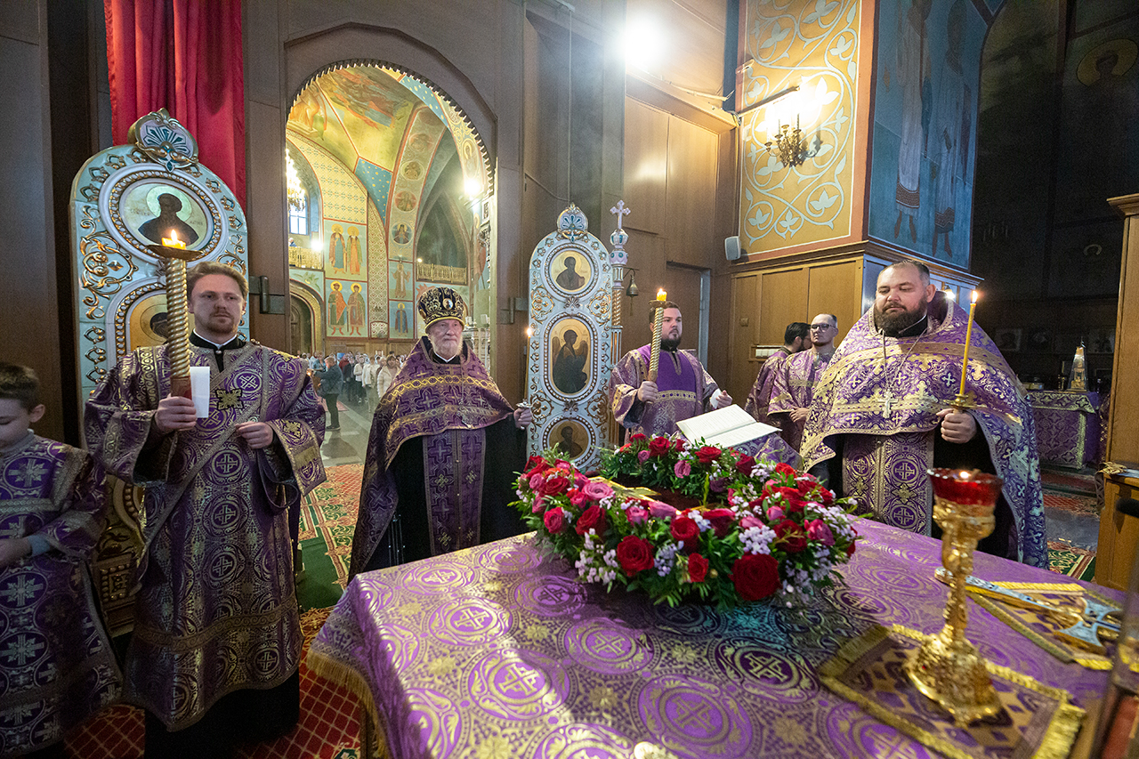 Во время богослужения для всенародного поклонения из Алтаря на праздничный аналой в центр храма был вынесен Крест Господень.