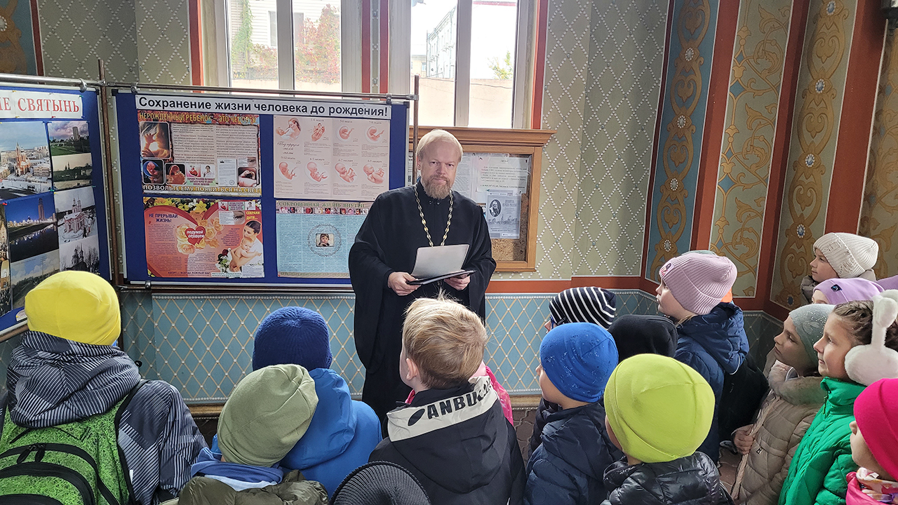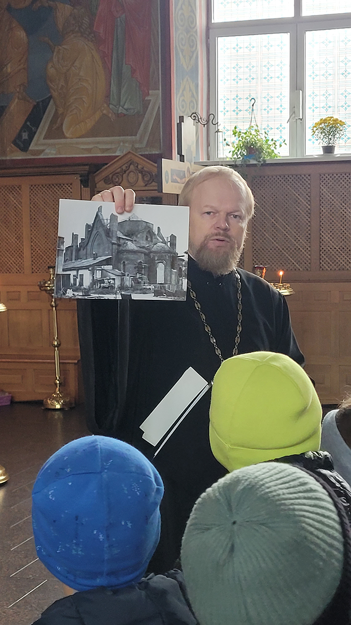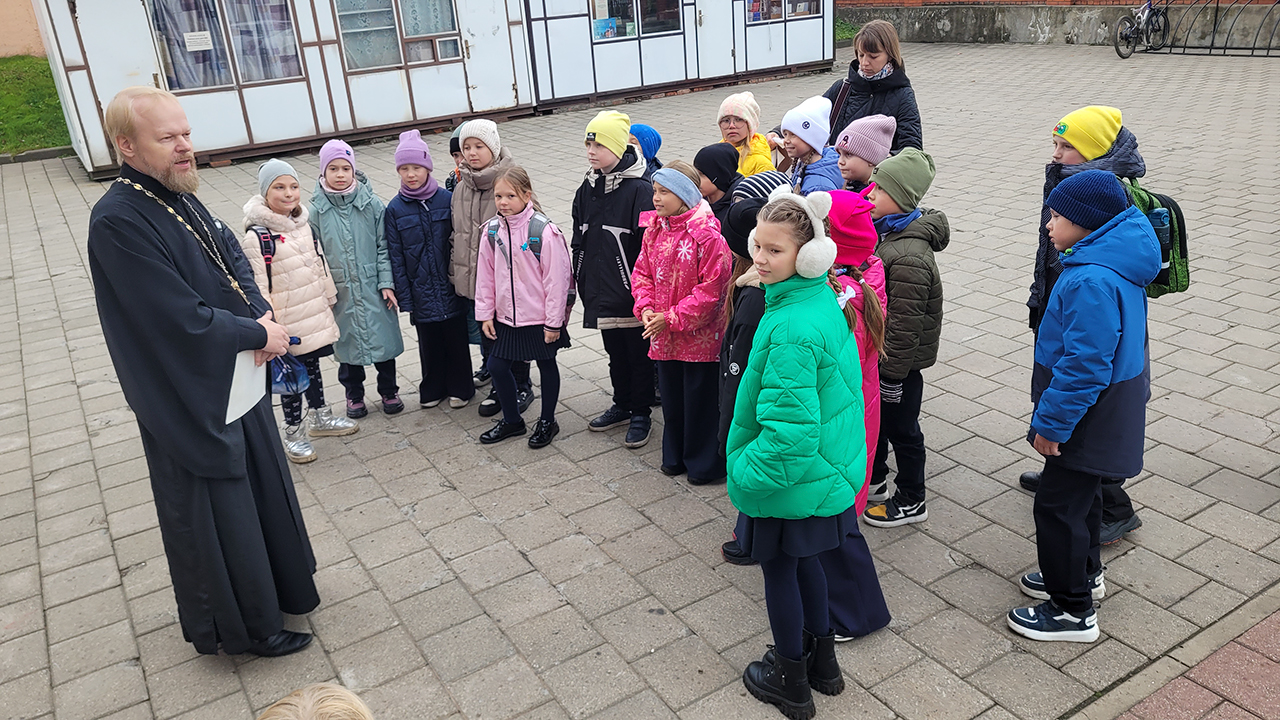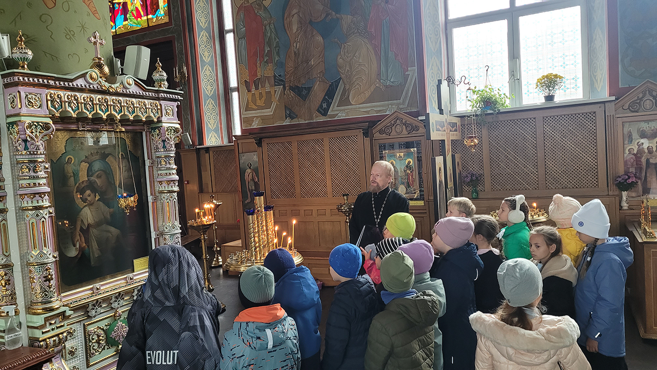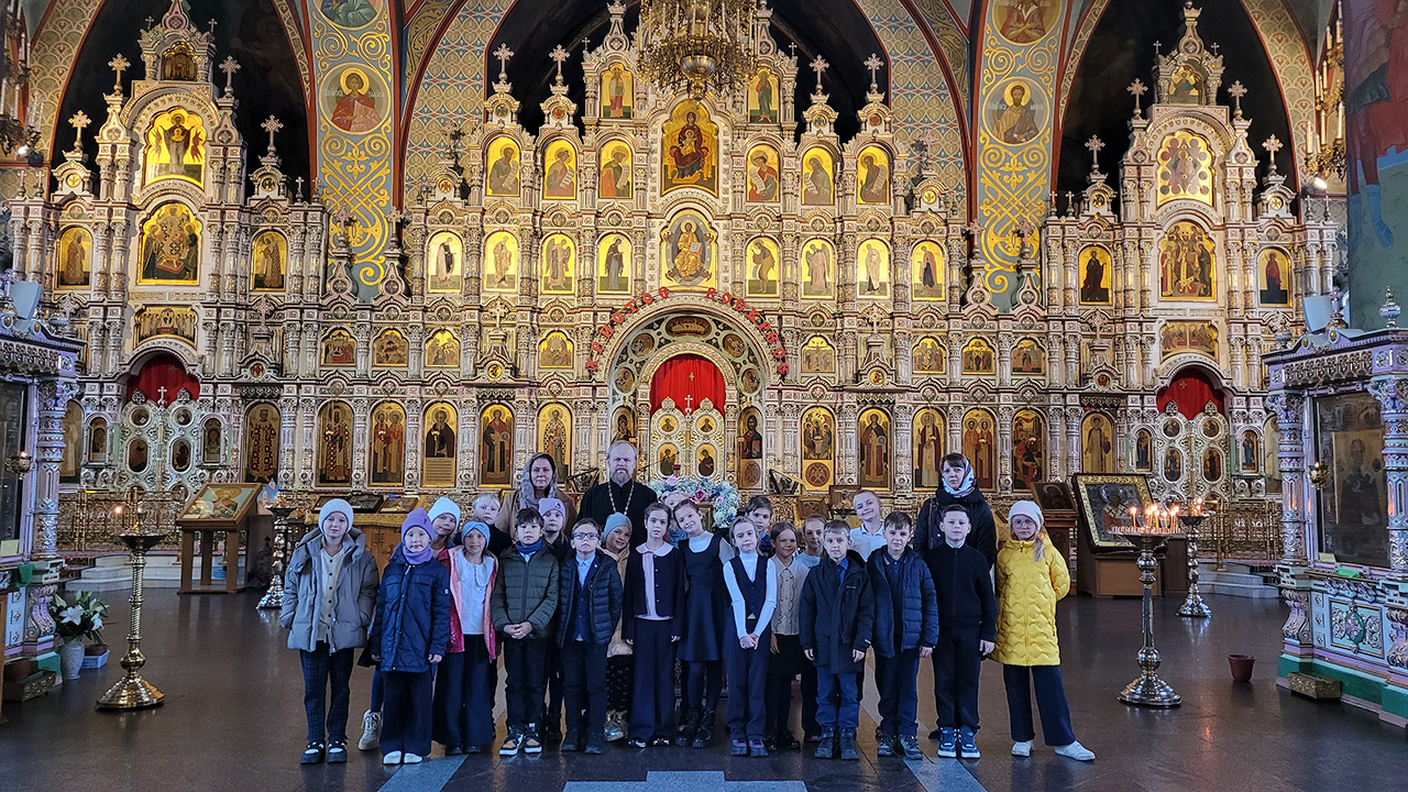 Клирик собора священник Димитрий Медведев провёл для гимназистов экскурсию, на которой рассказал про историю создания и восстановления храма, его архитектуре и местночтимых святынях. Гостей напоили чаем, после чего все поднялись на колокольню и позвонили в колокола.