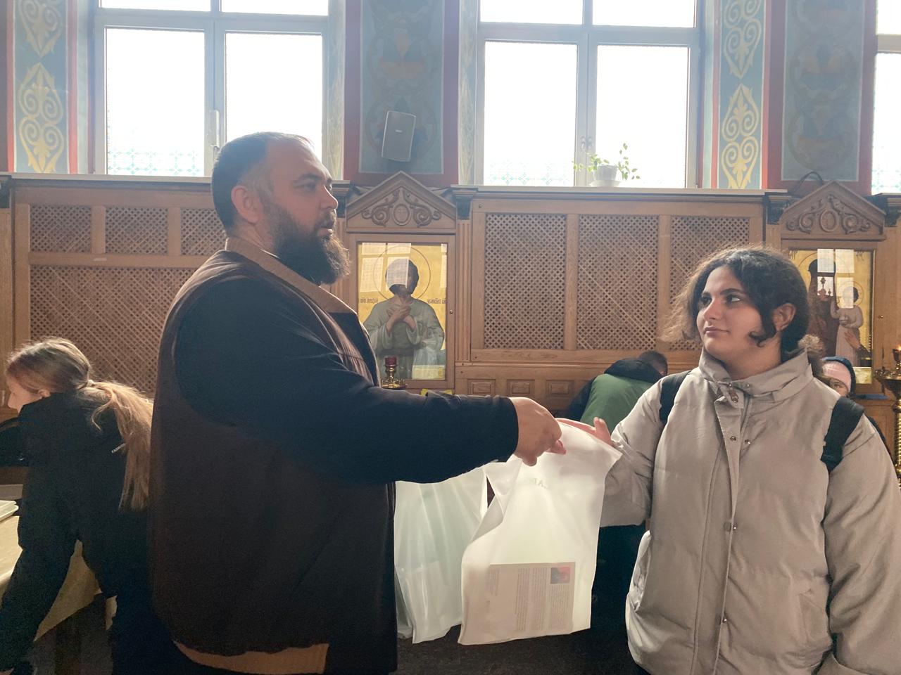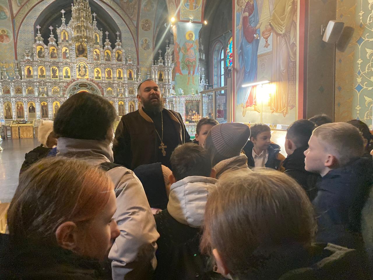 С ребятами беседовал клирик храма священник Андрей Засенко о истории возникновения Троицкого собора, его устройства, проводимых богослужениях. Батюшка также ответил на вопросы детей. В конце экскурсии сотрудники храма угостили ребят пирожками и булочками с компотом. Каждому школьнику от прихода был подарен памятный подарок.