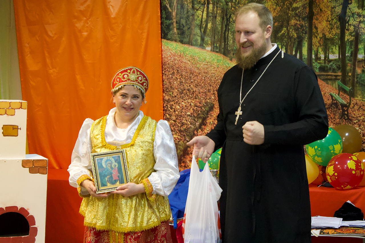 В завершение праздника батюшка поблагодарил за приглашение, пожелал здоровья, мира и Божией помощи детям, их родителям и воспитателям и подарил ребятам икону Богородицы и сладкие подарки!