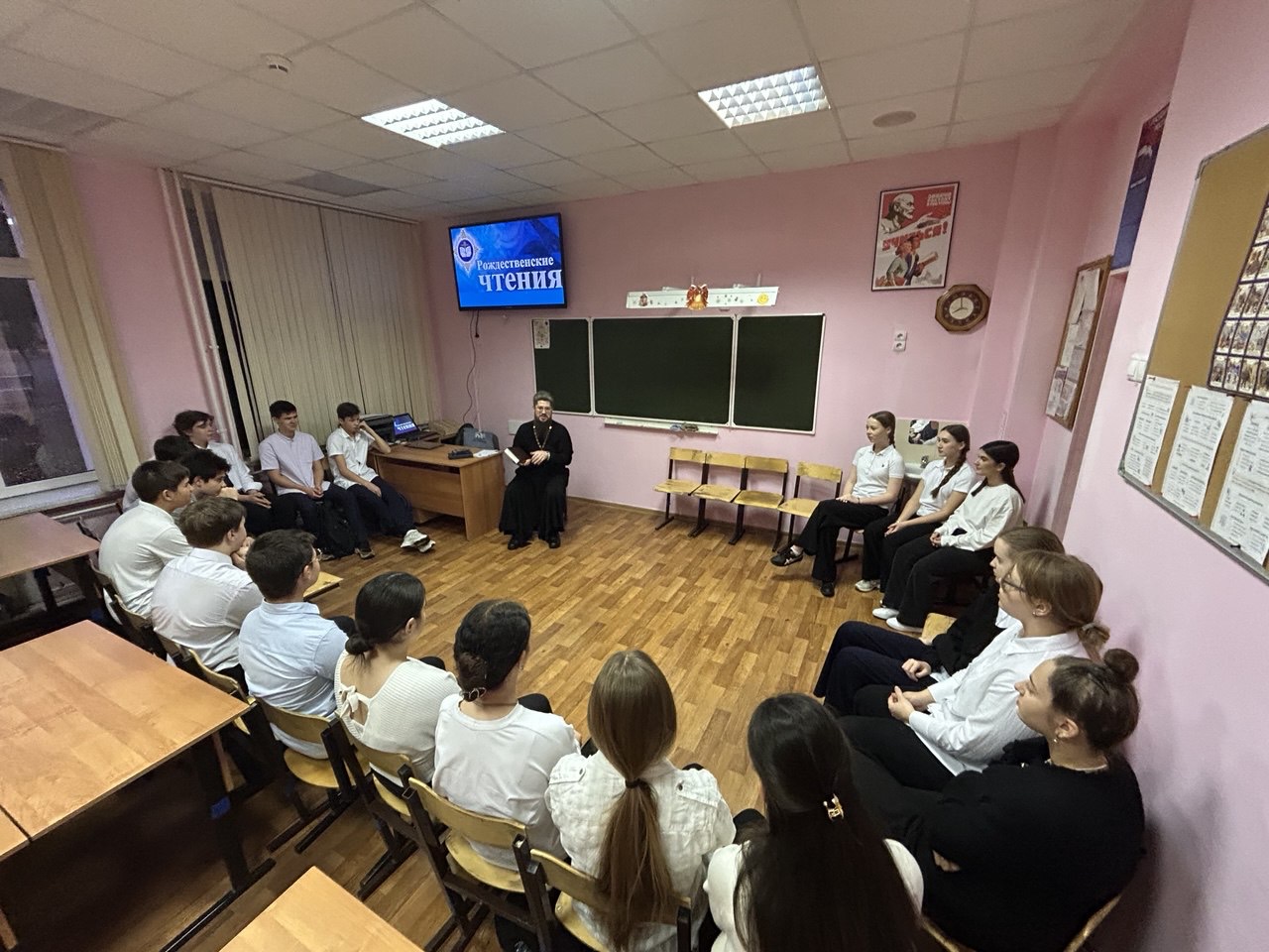 14 ноября, в рамках Московских областных Рождественских образовательных чтений «Просвещение и нравственность: формирование личности и вызовы времени», в школе №3 имени Героя Советского Союза А.Г.Дудкина города Фрязино прошла встреча учеников 9 «Б» класса с настоятелем Державного храма Наукограда священником Димитрием Третьяковым.