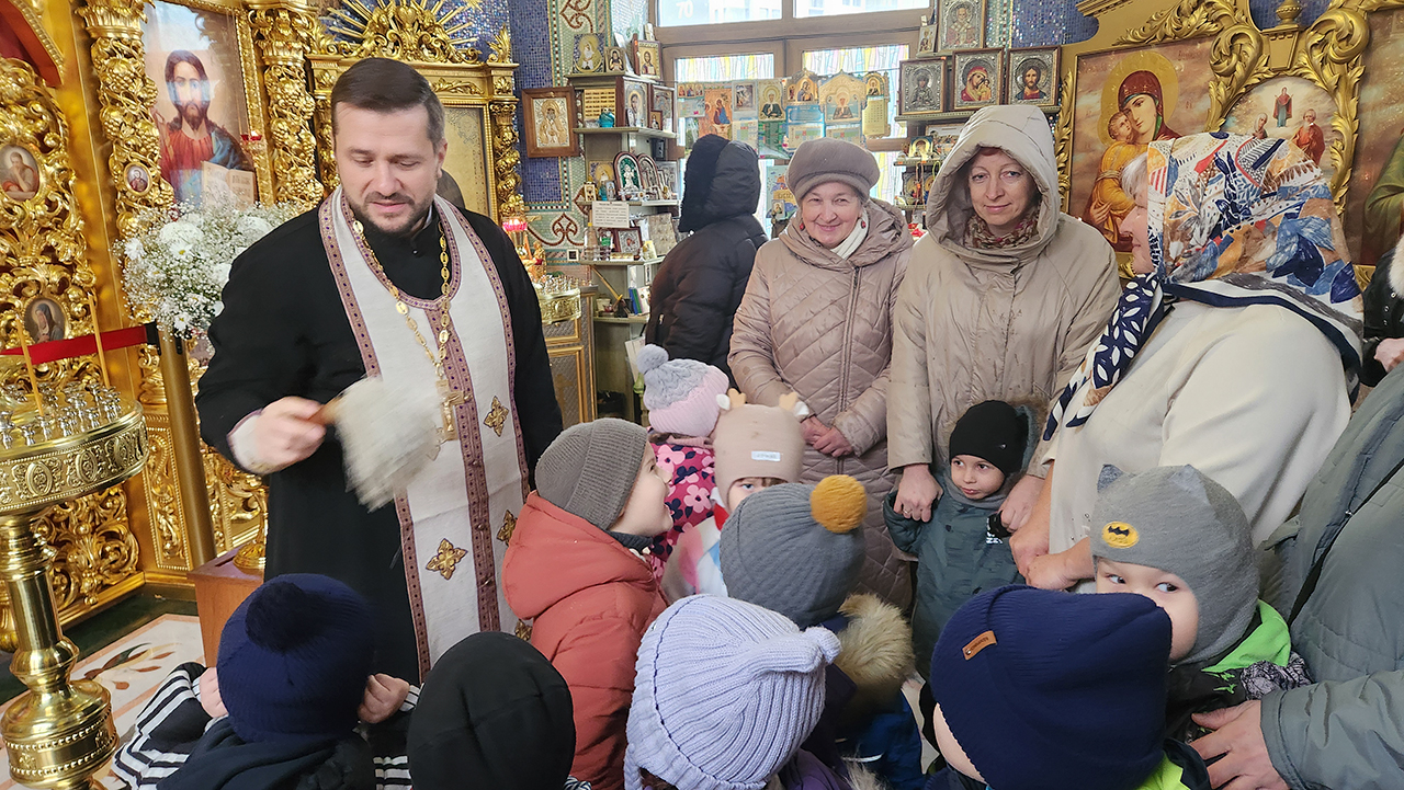 Экскурсию для ребят провел клирик храма священник Алексий Малевич. Батюшка рассказал о храме, мозаичном украшении, иконах, ответил на вопросы детей и взрослых, желающих помазал маслом от лампадки у иконы преподобного Серафима и окропил святой водой.