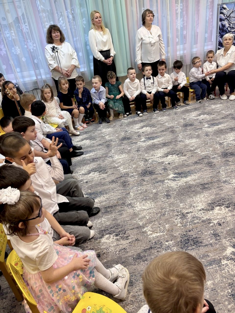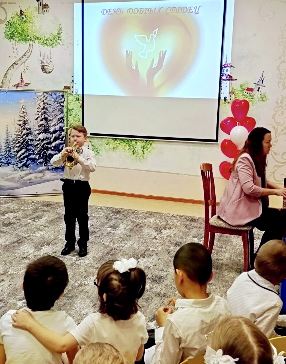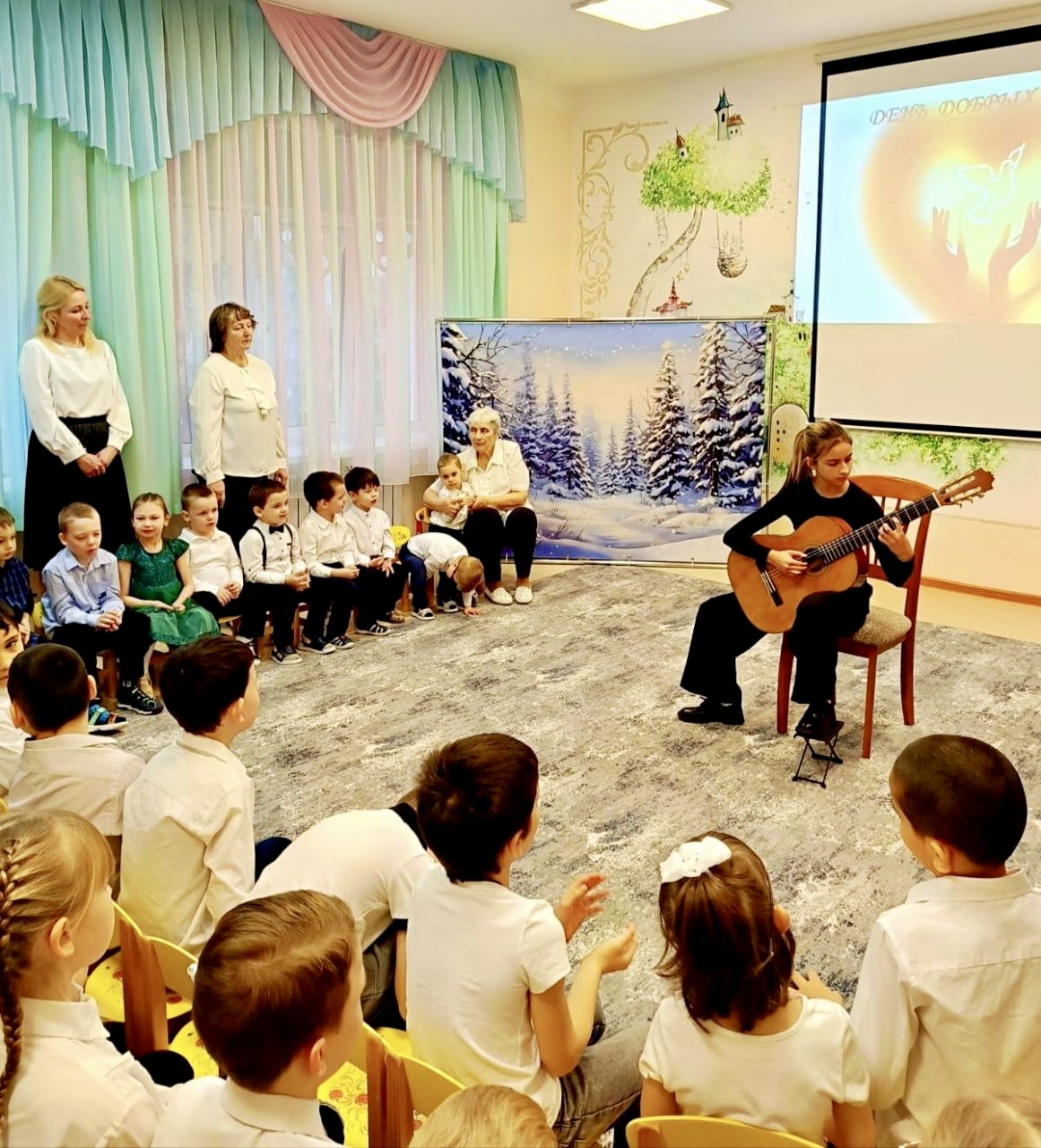 В этот день в гости к нашим маленьким воспитанникам пришли ребята и педагоги Фрязинской детской школы искусств им. М.И.Дунаевского с замечательным концертом. Юные музыканты играли на фортепиано, флейте, саксофоне и трубе. Особенно горячие овации вызвал баянист и гитаристка.