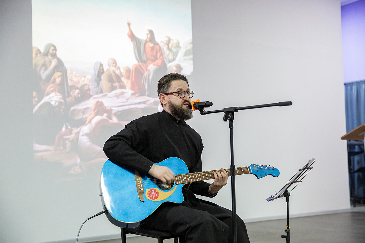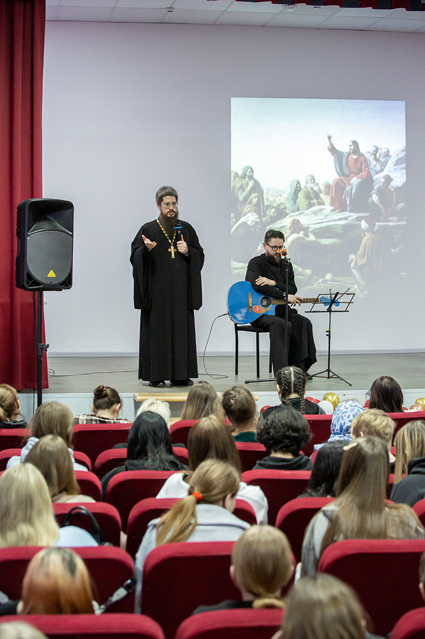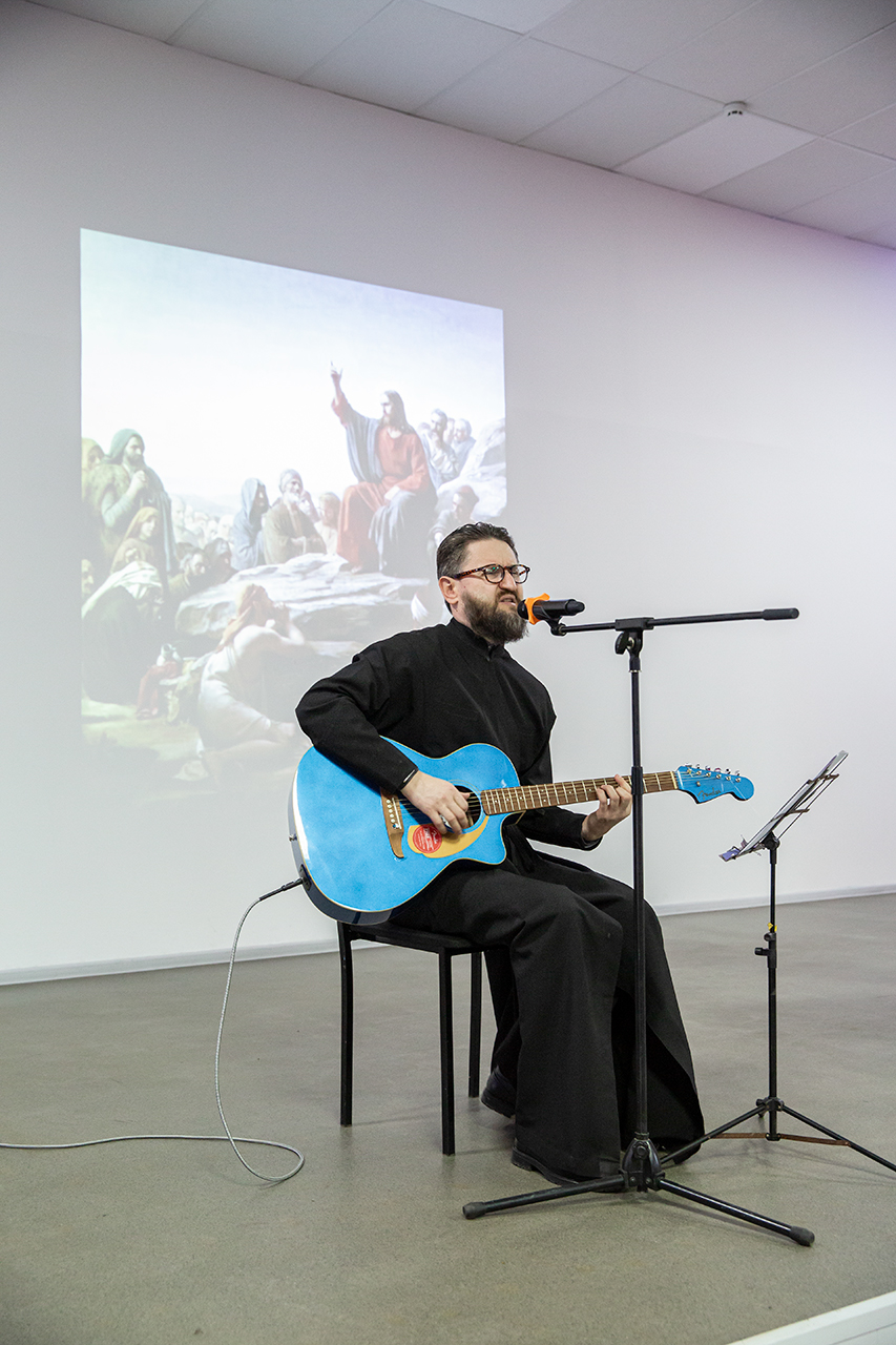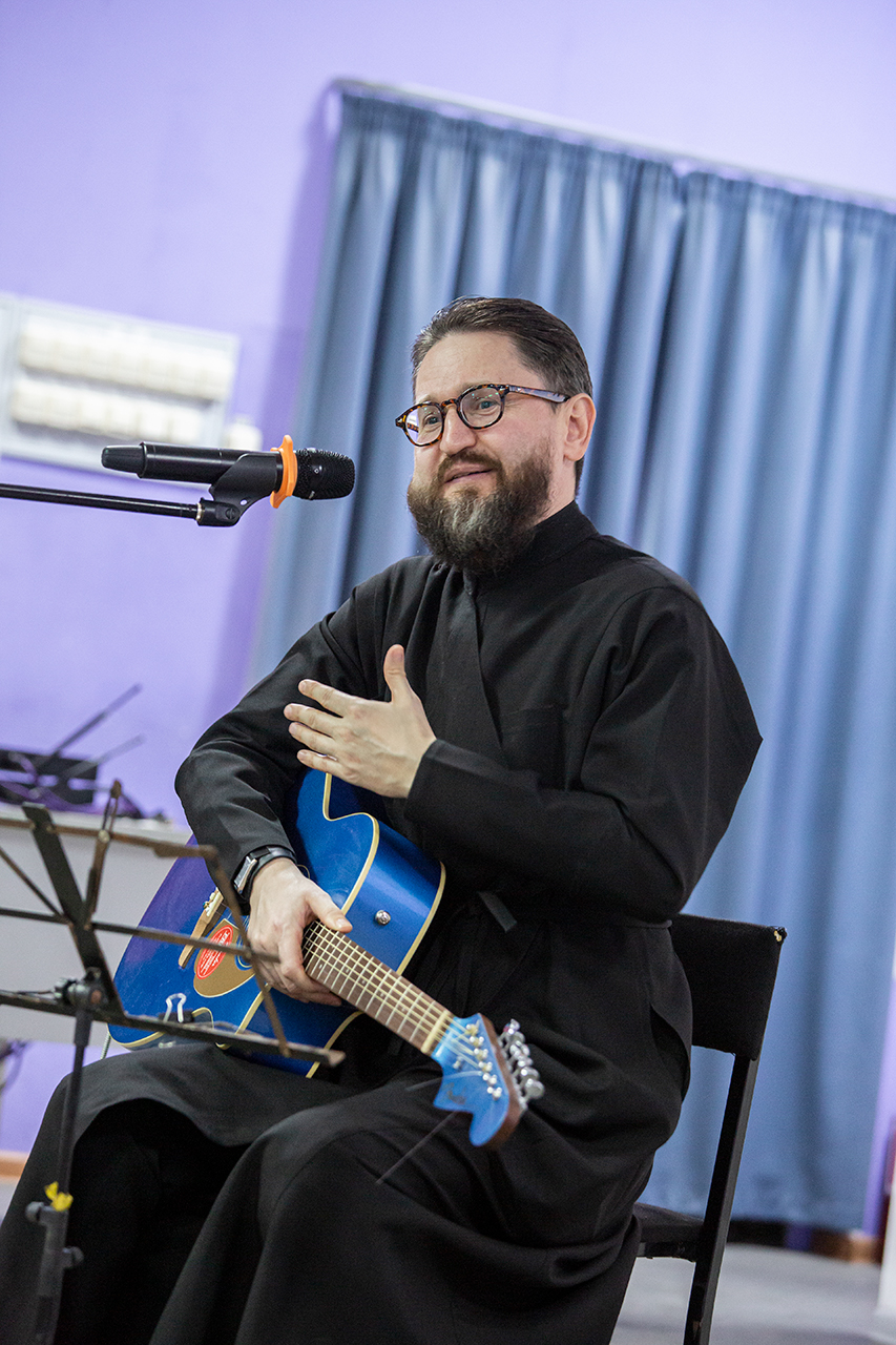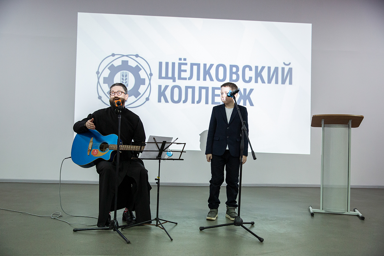 Перед учащимися с музыкальным сопровождением выступил миссионер и старший алтарник Троицкого собора города Щёлково, член Российского Союза писателей, автор-исполнитель Валерий Полянкин, который исполнил авторские песни.