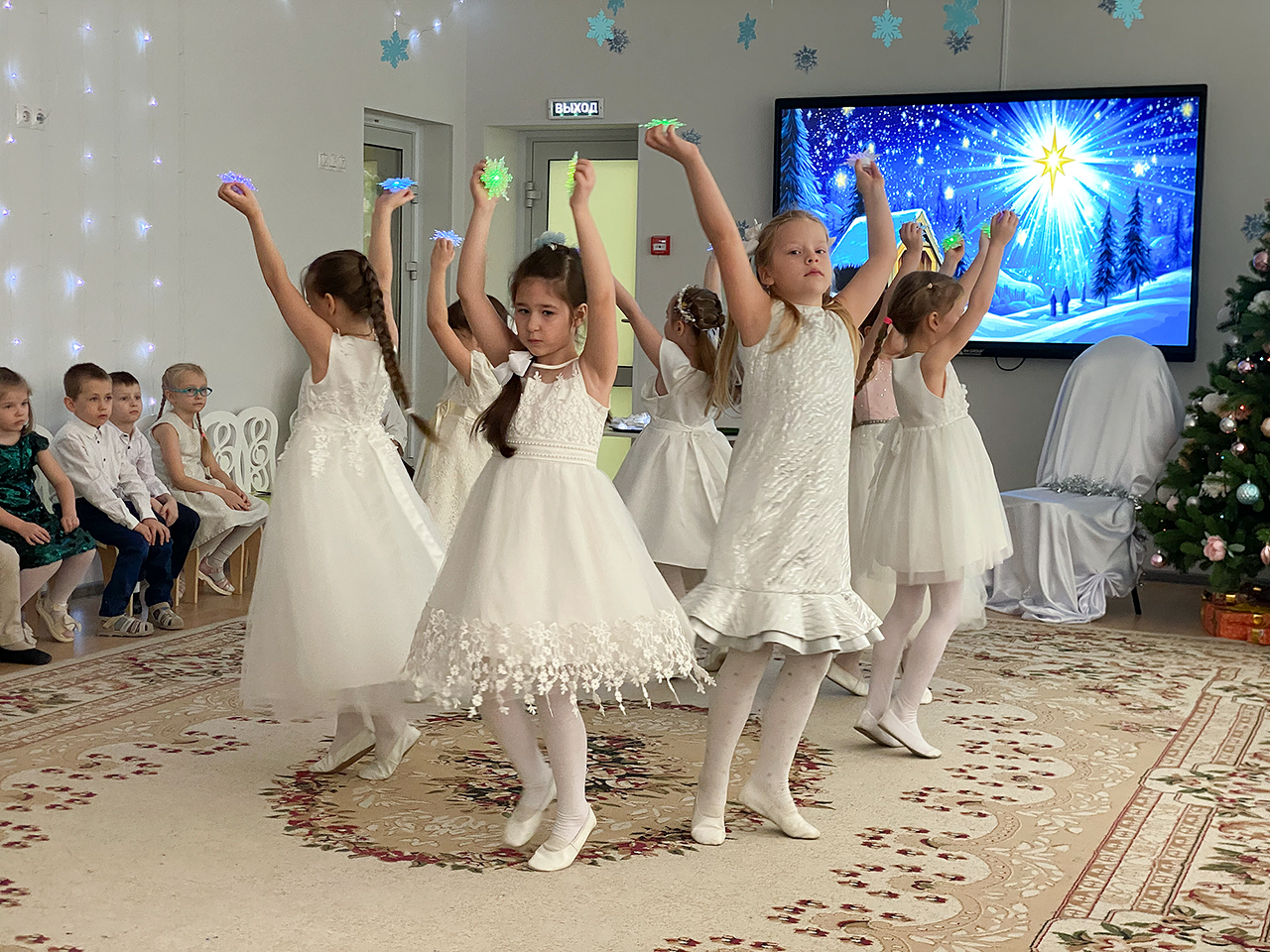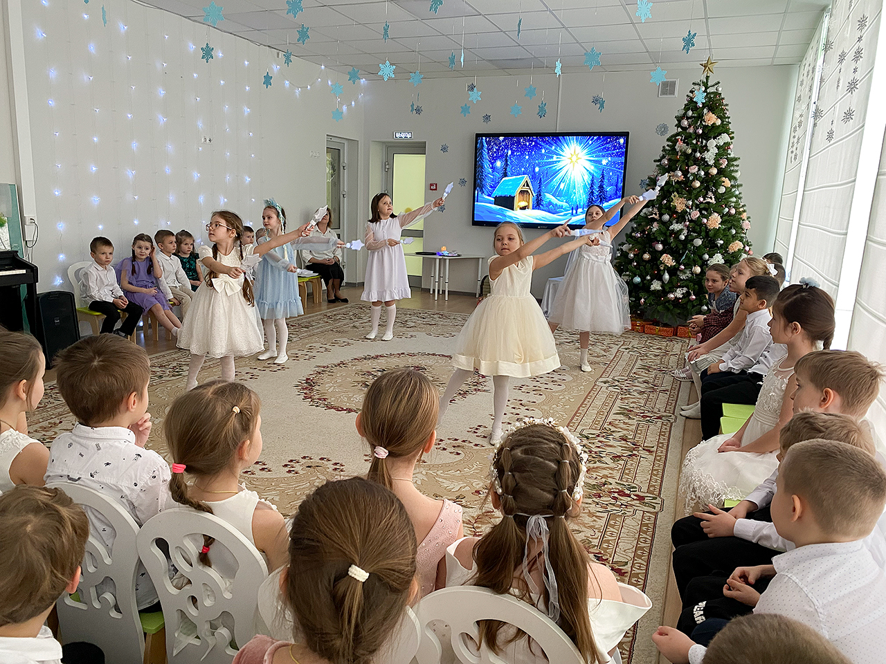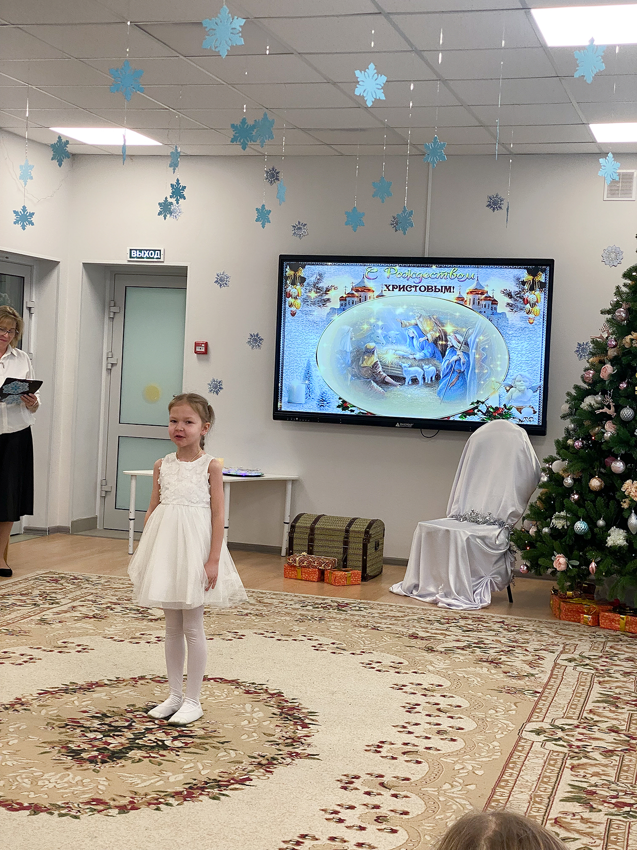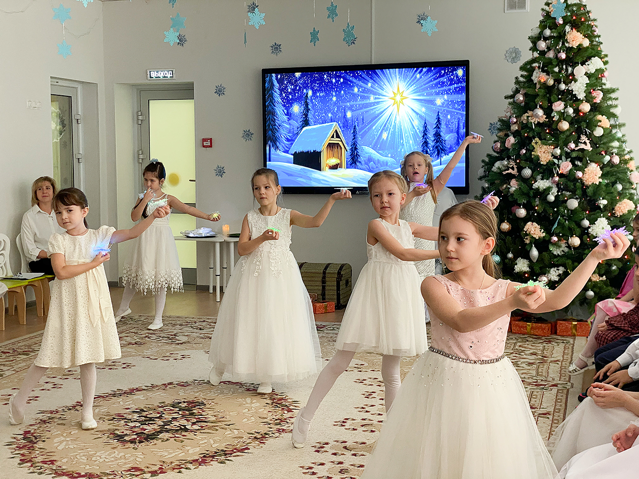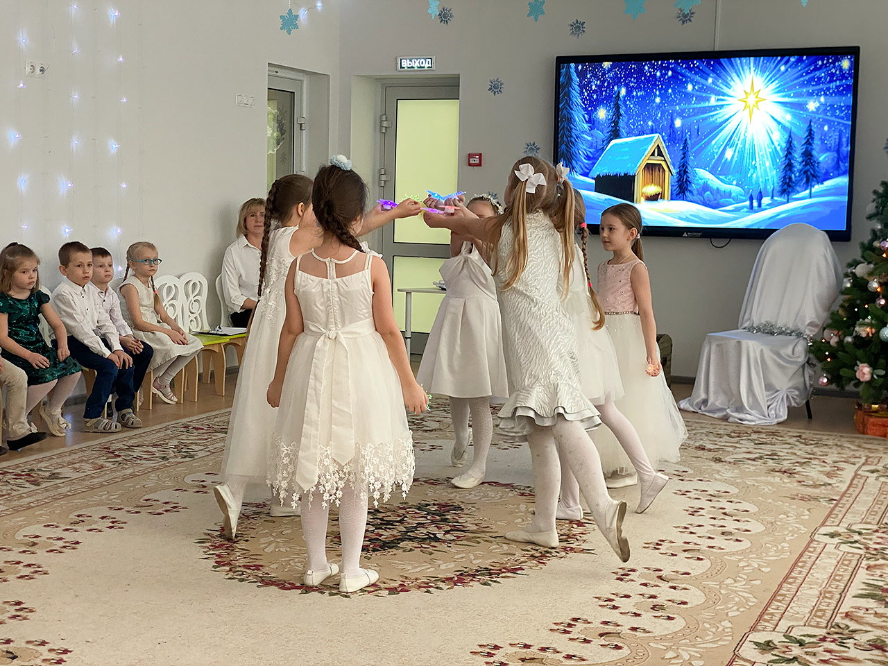На празднике дети пели, читали стихи. И даже воспитанники младшей группы «Василек» пришли на наш утренник, чтобы прочитать стихи во славу Христа! А девочки группы «Ромашка» подготовили очень красивые номера со светящимися снежинками и звездочками!