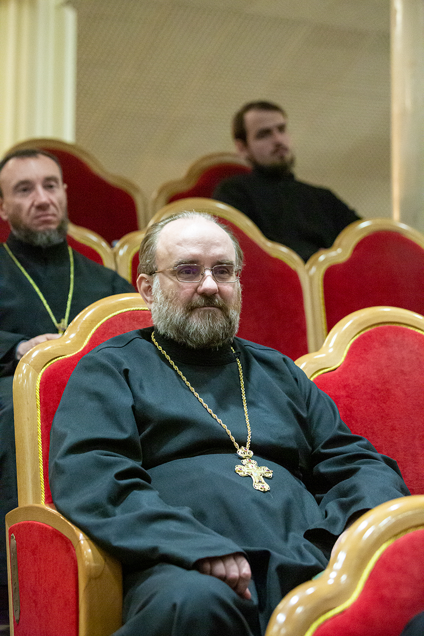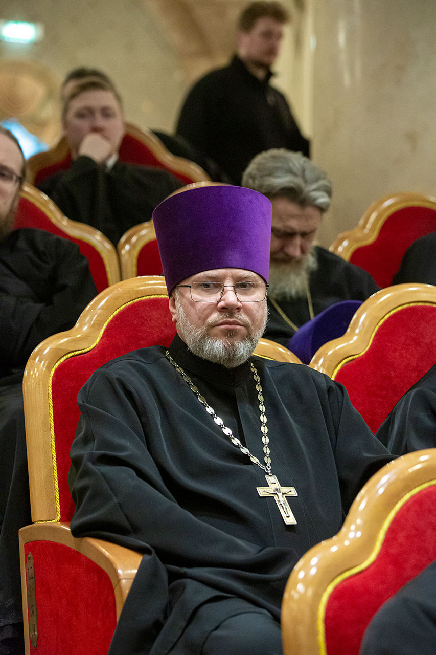 С докладом выступил председатель Межъепархиального отдела по взаимодействию с Вооруженными силами, правоохранительными органами и казачеством протоиерей Марк Ермолаев.