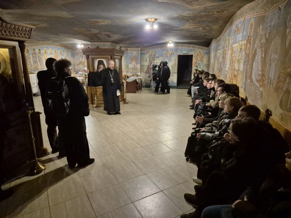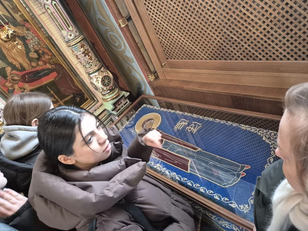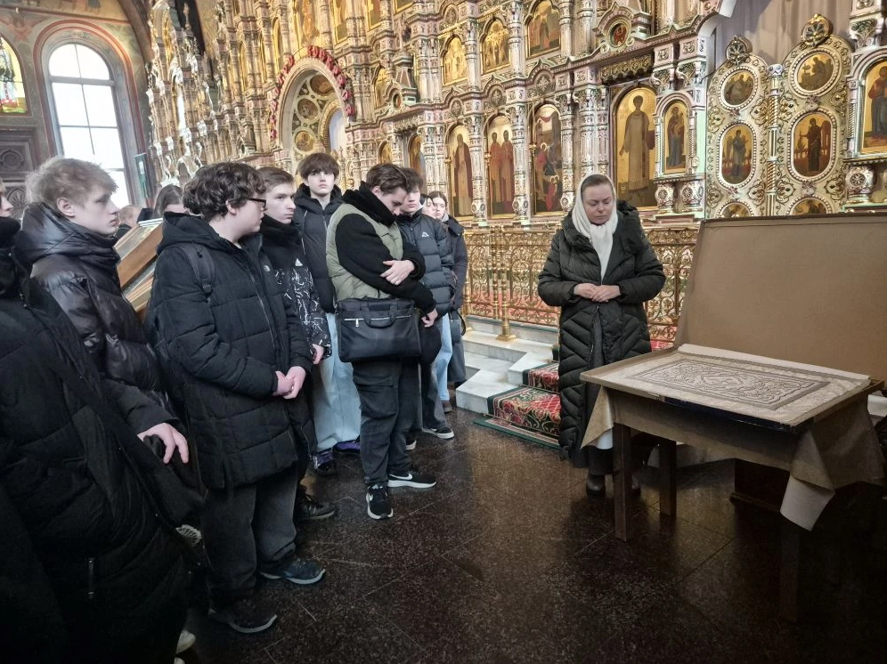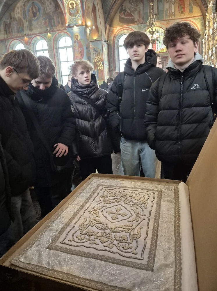 Экскурсию для ребят провел клирик собора священник Димитрий Медведев. Гости узнали про историю собора, посетили нижний храм. В ходе экскурсии ребята познакомились с произведениями церковного искусства. Работницами золотошвейной мастерской под руководством Натальи Хаджиной было создано уникальное произведение ручной вышивки – напрестольная Плащаница Спасителя. Работа эта выполнена в традициях византийской вышивки, с соблюдением канонов, в технике лицевого и золотного шитья.