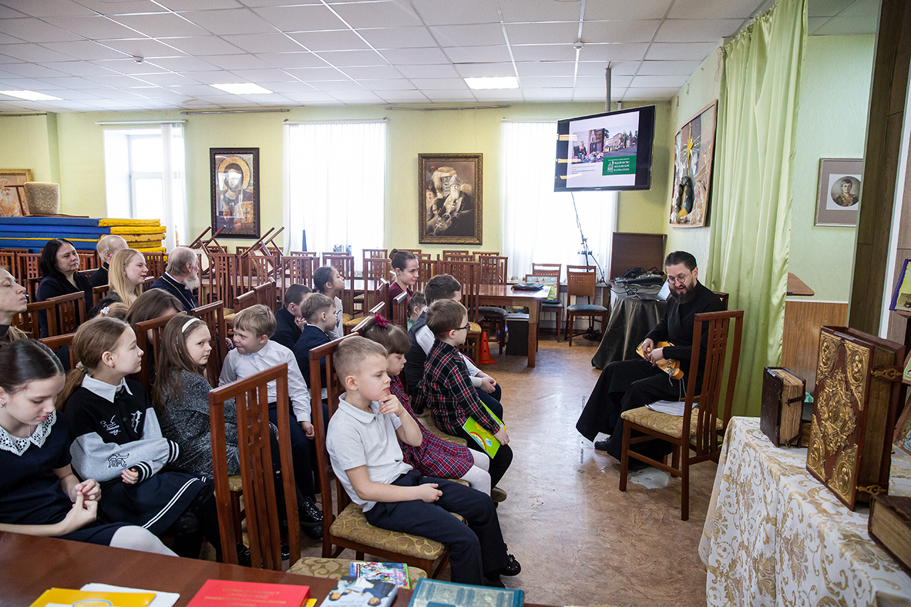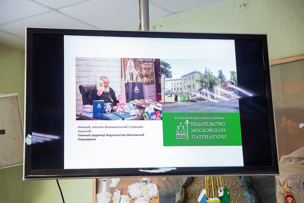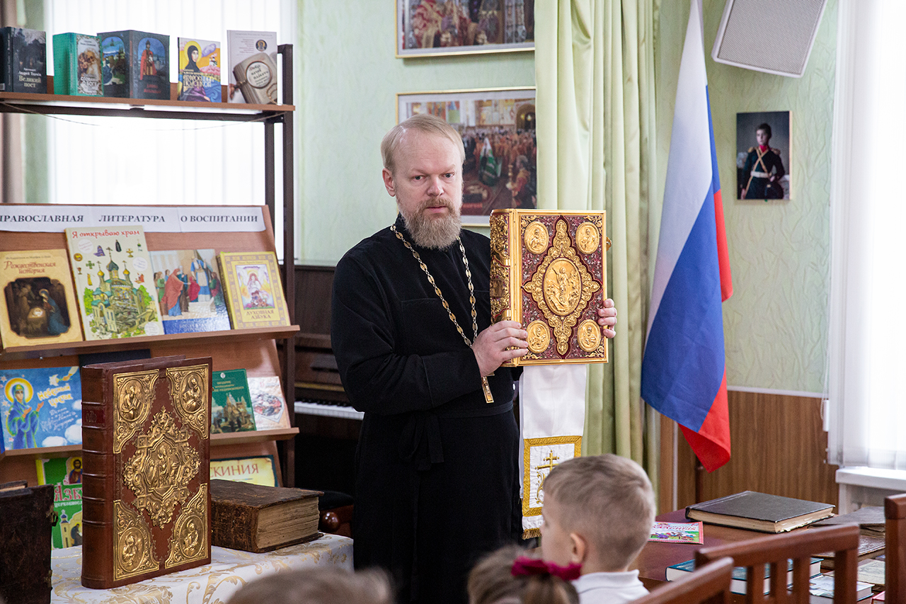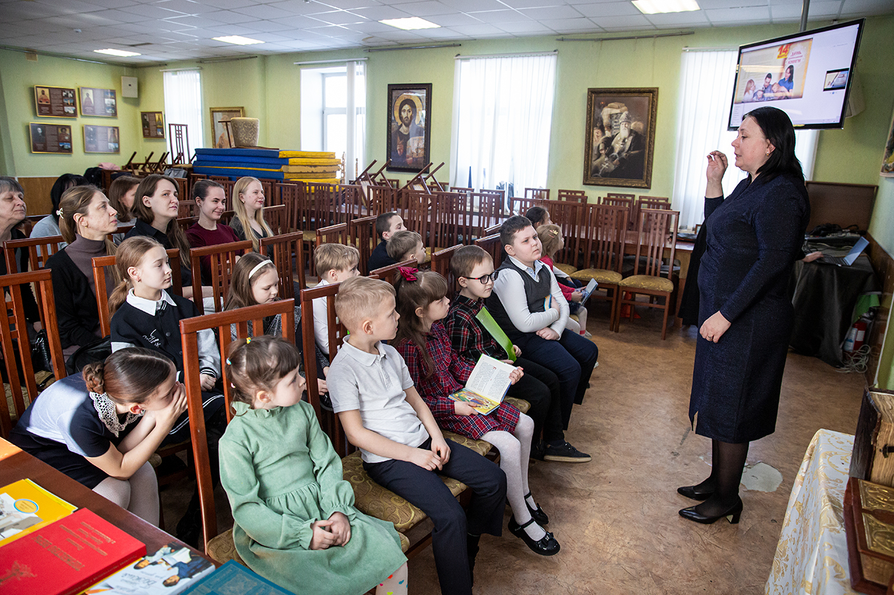 В конференц-зале, где была организована книжная мини-экспозиция, учащимся и родителям показали презентацию об истории праздника и книгопечатания. Клирик собора священник Димитрий Медведев рассказал ребятам о богослужебных книгах и современных изданиях Издательства Московской Патриархии. Директор воскресной школы Анна Александровна Медведева познакомила с учебной литературой и периодическими изданиями сборников XIX века. У ребят была возможность подержать в руках Евангелие XVIII века.